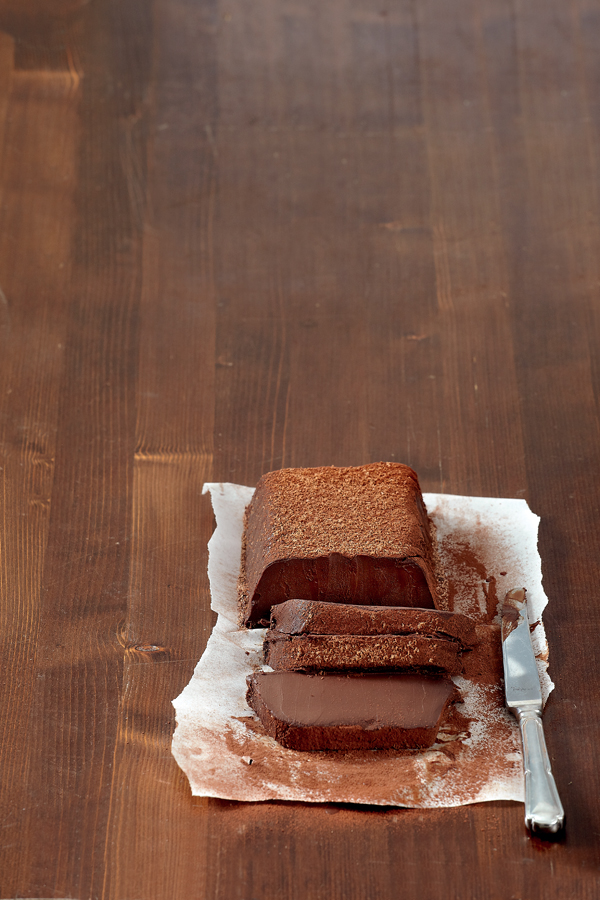 Βουτυρώνουμε ελαφρώς 1 μακρόστενη φόρμα για κέικ (ή ένα στρογγυλό τσέρκι), την καλύπτουμε εσωτερικά με χαρτί ψησίματος και την αφήνουμε στην άκρη. Σε σκεύος μπεν μαρί ζεσταίνουμε τη σοκολάτα σε χαμηλή θερμοκρασία μέχρι να λιώσει εντελώς και να γίνει ρευστή. Σε άλλο σκεύος ζεσταίνουμε (επίσης σε χαμηλή φωτιά) την κρέμα γάλακτος μαζί με τον εσπρέσο και το μπαχάρι. Μόλις η κρέμα ζεσταθεί αρκετά (όχι όμως να αρχίσει να βράζει), αποσύρουμε από τη φωτιά, ρίχνουμε το αλάτι και ανακατεύουμε. Προσθέτουμε τη λιωμένη σοκολάτα και με τη βοήθεια μιας πλαστικής σπάτουλας ανακατεύουμε με πολύ απαλές και αργές κινήσεις. Μόλις ομογενοποιηθεί το μείγμα, το αδειάζουμε στη φόρμα, καλύπτουμε με διάφανη μεμβράνη και το αφήνουμε στο ψυγείο για αρκετές ώρες (ή για όλο το βράδυ) μέχρι να σφίξει. Λίγο πριν από το σερβίρισμα, το βγάζουμε από το ψυγείο και ξεφορμάρουμε αναποδογυρίζοντάς το σε ένα δίσκο. Το αφήνουμε για 10 λεπτά να έρθει σε θερμοκρασία δωματίου, πασπαλίζουμε με κακάο και το κόβουμε σε φέτες.