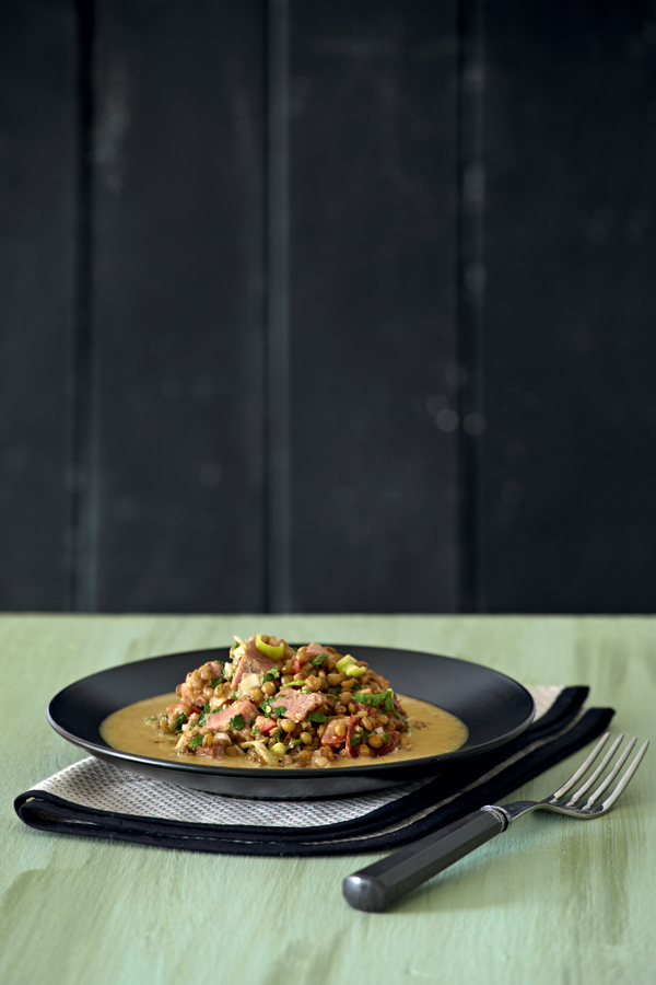 Σάλτσα: Ρίχνουμε στο multi τις φακές που έχουμε κρατήσει στην άκρη, το μέλι, τη μουστάρδα, το ξίδι, αλατοπίπερο και χτυπάμε ρίχνοντας λίγο λίγο το λάδι, μέχρι η σάλτσα να δέσει. Αν σφίξει πολύ η σάλτσα, την αραιώνουμε με λίγο ξίδι και νερό. Διορθώνουμε το αλάτι και το πιπέρι και σερβίρουμε απλώνοντας τη σάλτσα στη βάση του πιάτου και από πάνω τις φακές με το σύγκλινο.