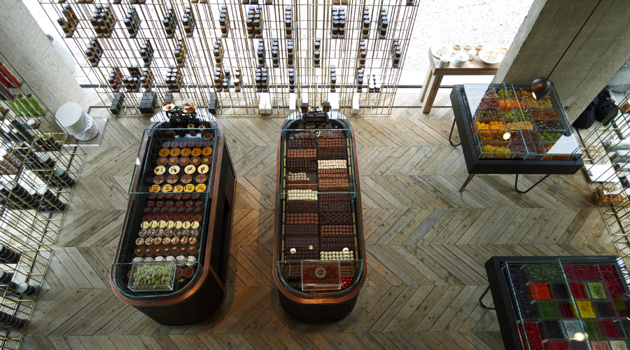 Ζεστό, με υποβλητικό, θεατρικό φως, δεν θυμίζει σε τίποτε ζαχαροπλαστείο. Βιτρίνες με παλαιωμένο μπρούντζο, ψυγεία που παίζουν με την έννοια του κοσμηματοπωλείου, μπρούντζινες κάθετες βέργες που τρέχουν από το ταβάνι και μεταμορφώνονται σε εταζέρες της εξωτερικής βιτρίνας, εμφανές τσιμέντο, ματ αβερνίκωτο ξύλινο δάπεδο και προβολείς θεάτρου παντρεύονται με παλιές προθήκες, τεράστιες γυάλες και σύνεργα ζαχαροπλαστικής.