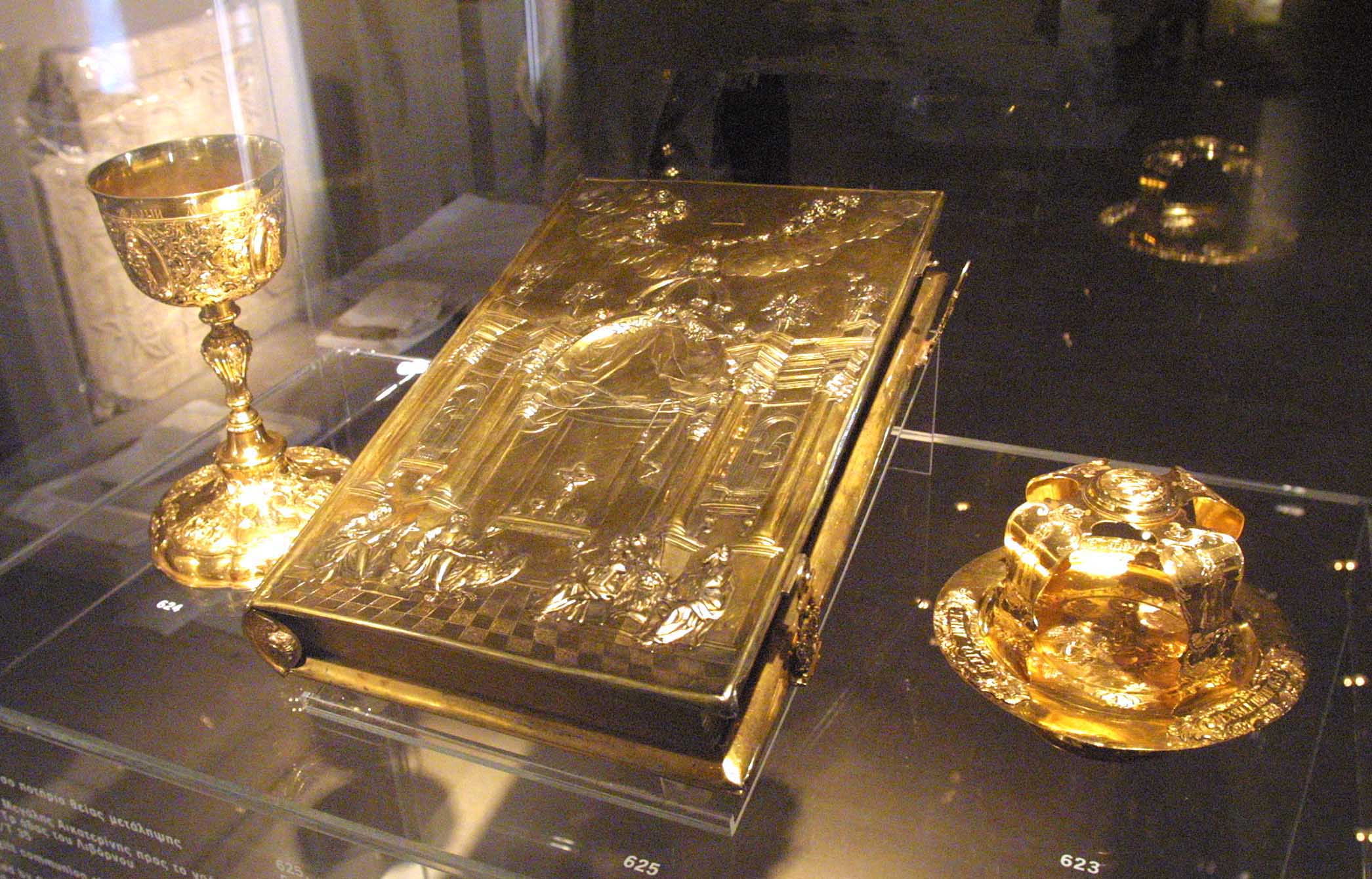– « Ο χριστιανικός κόσμος» αναφέρεται στην χριστιανική ταυτότητα της Βυζαντινής Αυτοκρατορίας και αποσκοπεί στην παρουσίαση της καθιέρωσης του χριστιανισμού ως μίας και μόνης θρησκείας του κράτους και στην αποκρυστάλλωση της φυσιογνωμίας της Βυζαντινής αυτοκρατορίας. Στην ενότητα αυτή παρουσιάζονται 15 βυζαντινά χρυσά νομίσματα ως τεκμήρια της επίσημης αυτοκρατορικής ιδεολογίας και της στενής εξάρτησης κράτους και εκκλησίας στο Βυζάντιο. Επίσης παρουσιάζεται η μεταμόρφωση του δημόσιου χώρου με έμφαση στη μορφή, τη λειτουργία και τον διάκοσμο του βυζαντινού ναού ενώ παράλληλα μέσα από τοιχογραφίες, εικόνες και εκκλησιαστικά σκεύη θα αναδειχθούν οι καλλιτεχνικές τάσεις που επικρατούν στη Βυζαντινή αυτοκρατορία όπως επίσης και η εγχώρια καλλιτεχνική έκφραση των εργαστηρίων σημαντικών πόλεων του ελλαδικού κόσμου (όπως Θεσσαλονίκη, Βέροια, Καστοριά). Μία ακόμη υποενότητα εξάλλου εστιάζει στις ποικίλες όψεις της ιδιωτικής λατρείας τη θέση της χριστιανικής τέχνης στη ζωή των Βυζαντινών καθώς και στη σημασία της λατρείας των κειμηλίων.