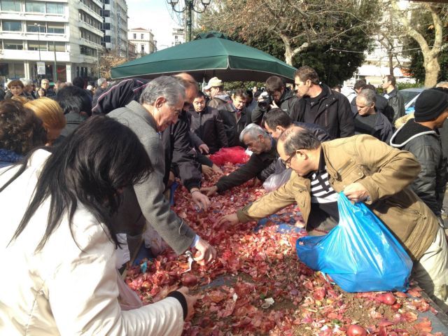 Μέσα σε τρεις ώρες περίπου 20 τόνοι κάθε είδους οπωρολαχανικών – πατάτες, καρότα, σπανάκι, μπρόκολα, λάχανα και κρεμμύδια – έγιναν καπνός» και όταν οι παραγωγοί είχαν αρχίσει γύρω στις 11.00 να μαζεύουν τους πάγκους τους συνταξιούχοι συνέχισαν να ψάχνουν ανάμεσα στα φλούδια και να αναποδογυρίζουν τα σακιά μήπως έχει ξεμείνει κανένα κρεμμύδι!