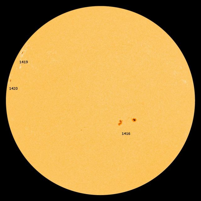 Ο δορυφόρος SDO (Solar Dynamic Observatory) που παρακολουθεί την ηλιακή δραστηριότητα εντόπισε δύο κηλίδες το μέγεθος των οποίων αυξάνεται πολύ τα τελευταία 24ωρα. Οι δύο κηλίδες βρίσκονται στην περιοχή 1416 του μητρικού μας άστρου και τις τελευταίες μέρες το μέγεθος τους έχει διπλασιαστεί. Οι δύο κηλίδες είναι ιδιαίτερα ενεργές και παράγουν μαγνητικές καταιγίδες. Σύμφωνα με τους ειδικούς οι εκλάμψεις των δύο κηλίδων είναι της κατηγορίας Μ που είναι η δεύτερη σε ισχύ κατηγορία εκλάμψεων. Οι πιο ισχυρές εκλάμψεις των ηλιακών κηλίδων είναι οι εκλάμψεις Χ.