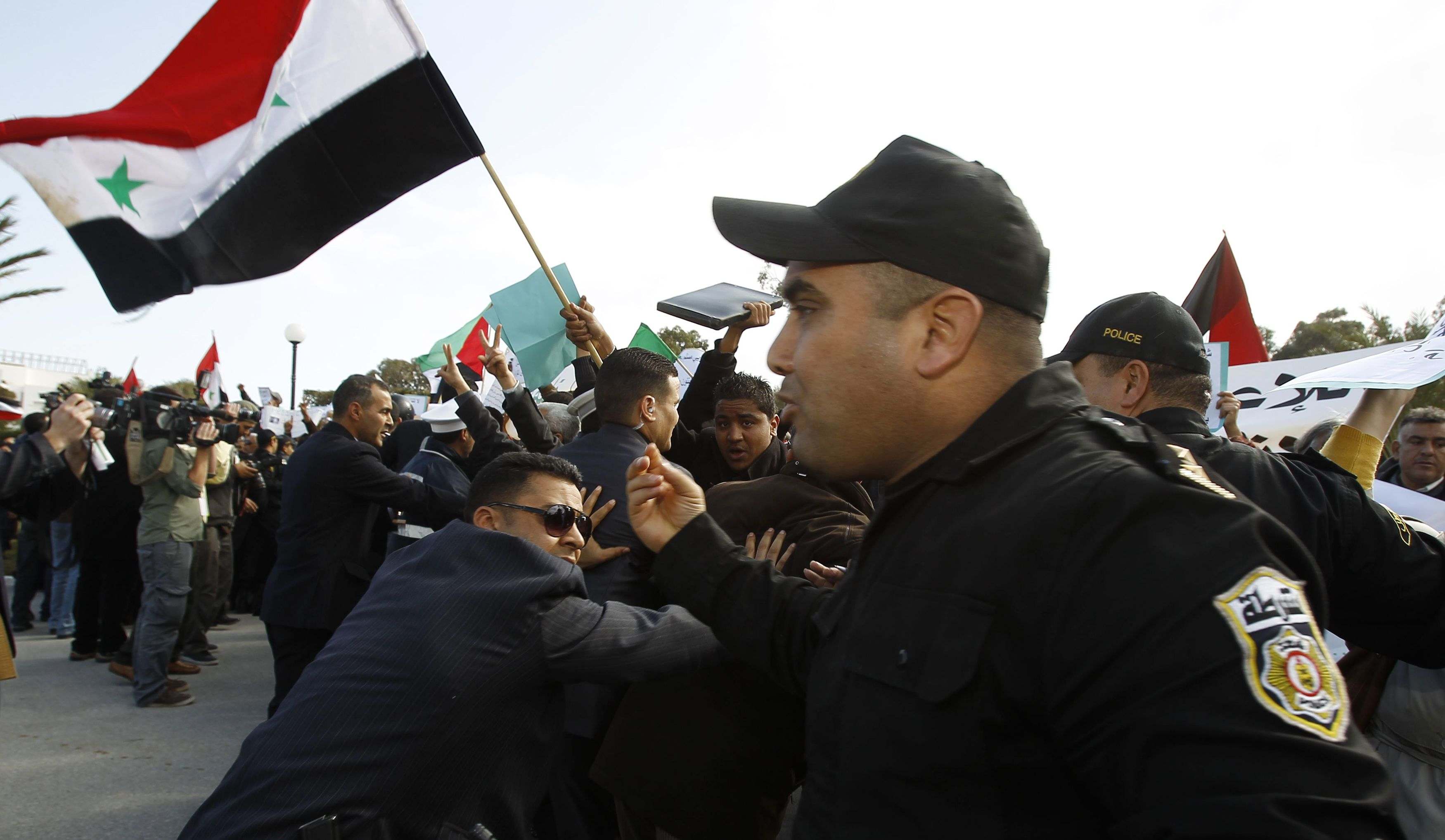 Το καθεστώς Άσαντ έκανε πάντως ορατή την παρουσία του και στην Τύνιδα: εκατοντάδες υποστηρικτές του προέδρου Μπασάρ αλ Άσαντ μπήκαν διά της βίας στους περιβάλλοντες χώρους του ξενοδοχείου στην Τύνιδα όπου προετοιμαζόταν η σύνοδος. Απωθήθηκαν με τα γκλόμπ από την Αστυνομία.