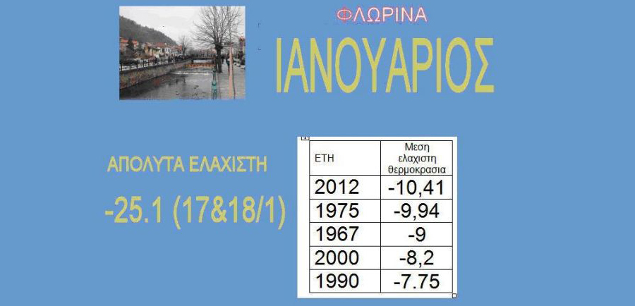 Η απόλυτη ελάχιστη θερμοκρασία της τελευταίας πενηντακονταετίας καταγράφηκε τον φετινό Ιανουάριο στη Φλώρινα. Το θερμόμετρο του τοπικού σταθμού της Εθνικής Μετεωρολογικής Υπηρεσίας στις 17 και 18 Ιανουαρίου έδειξε 25,1 βαθμούς Κελσίου υπό το μηδεν.