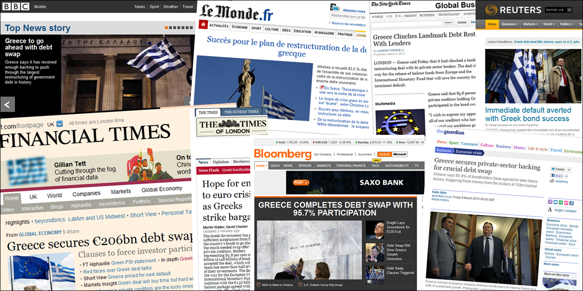 Πρώτο θέμα στα διεθνή μέσα ενημέρωσης είναι η ανταλλαγή ομολόγων στην Ελλάδα. Αμέσως μετά την ανακοίνωση για τη συμφωνία, τα περισσότερα ξένα ΜΜΕ μετέδωσαν εκτάκτως την είδηση, μιλώντας για επιτυχημένη ανταλλαγή ομολόγων και για αποφυγή της χρεοκοπίας με τη «μεγαλύτερη αναδιάρθρωση χρέους στην ιστορία».