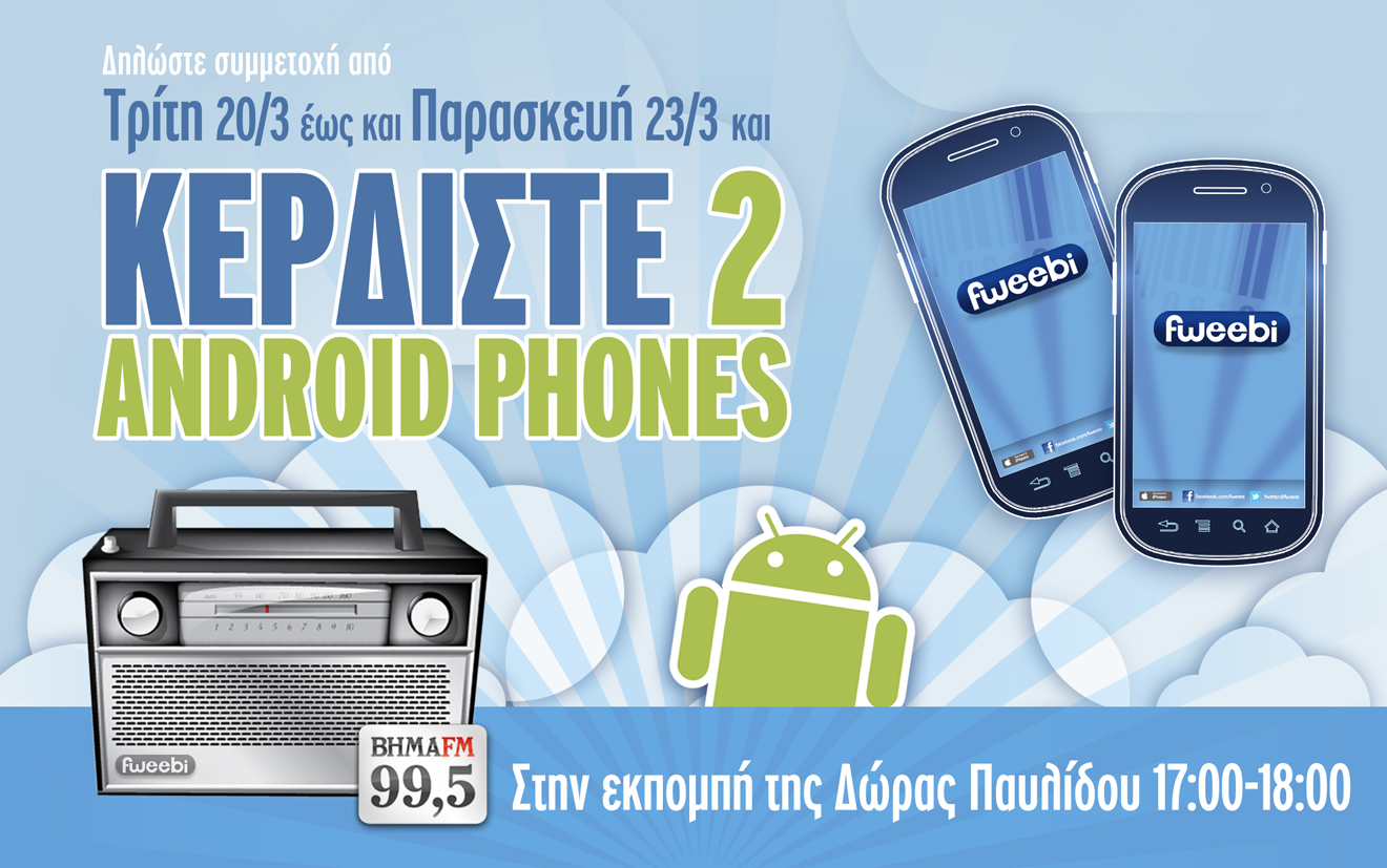 H κλήρωση για το 2 android Smartphone της Vodafone σε συνεργασία με τοFweebi έγινε στον αέρα λίγο πριν τις 18.00 την Παρασκευή 23/3/2012. Η νικήτρια ΜΕ ΤΟ LIKE ΤΗΣ είναι η Ελένη Παρασίδη η οποία επικοινώνησε μαζί μας προκειμένου να παραλάβει το δώρο της. Το δεύτερο κινητό ΜΕ ΤΟ SMS ΤΗΣ κέρδισε η Κορίνα Γεωργαρίου. Εχουμε επικοινωνήσει μαζί τους προκειμένου να πάρουν τα δώρα τους. Ευχαριστούμε όλους όσους συμμετείχαν στο διαγωνισμό και σας υποσχόμαστε κι άλλα συναρπαστικά πράγματα μέσα από τους 99,5 και τον Vimafm! Ο ΔΙΑΓΩΝΙΣΜΟΣ ΜΑΣ Ο ΟΠΟΙΟΣ ΟΛΟΚΛΗΡΩΘΗΚΕ