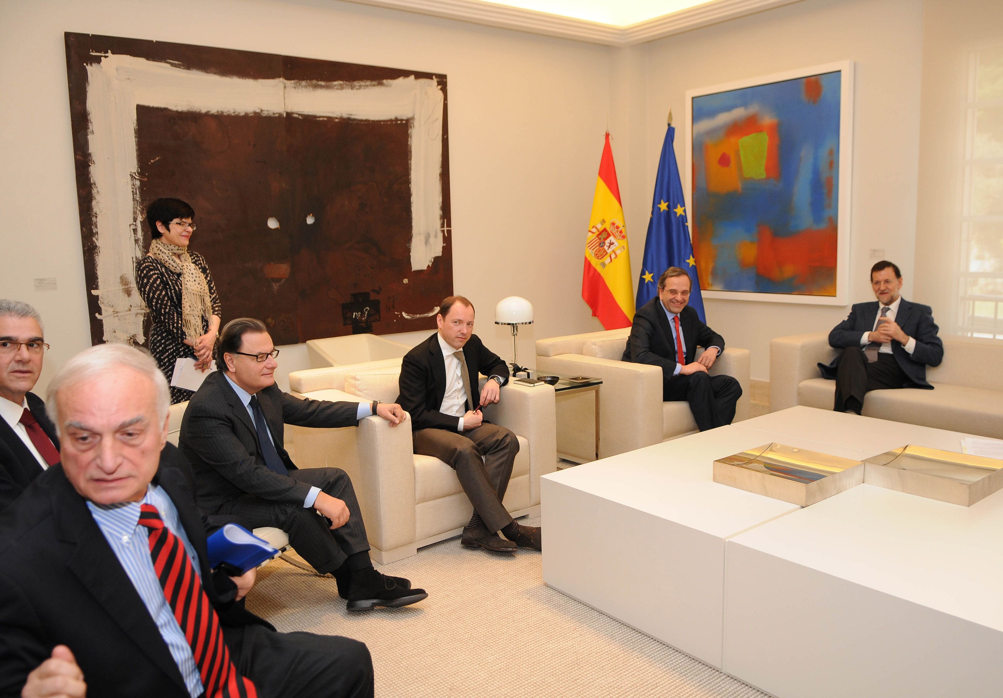 Οι κκ. Ραχόι και Σαμαράς είχαν μια διεξοδική συζήτηση για την κατάσταση που διαμορφώνεται στην ευρωζώνη και τις πιέσεις που ασκεί κυρίως η Γερμανική πλευρά ως προς τα δημοσιονομικά και συμφώνησαν ότι οι χώρες του Νότου και ιδιαίτερα η Ελλάδα και η Ισπανία, να βοηθηθούν με την υιοθέτηση μέτρων ανάκαμψης και ανάπτυξης των οικονομικών τους.