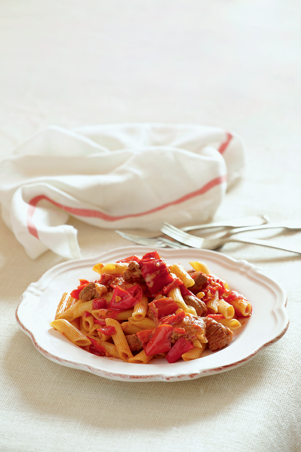 Σε άλλη κατσαρόλα με άφθονο αλατισμένο νερό που κοχλάζει βράζουμε τις πένες, μέχρι να γίνουν al dente. Τις στραγγίζουμε, τις ρίχνουμε στην κατσαρόλα με το κρέας, προσθέτουμε το κεφαλοτύρι, ανακατεύουμε καλά, μέχρι να λιώσει και να μαστιχώσει το τυρί, και σερβίρουμε.