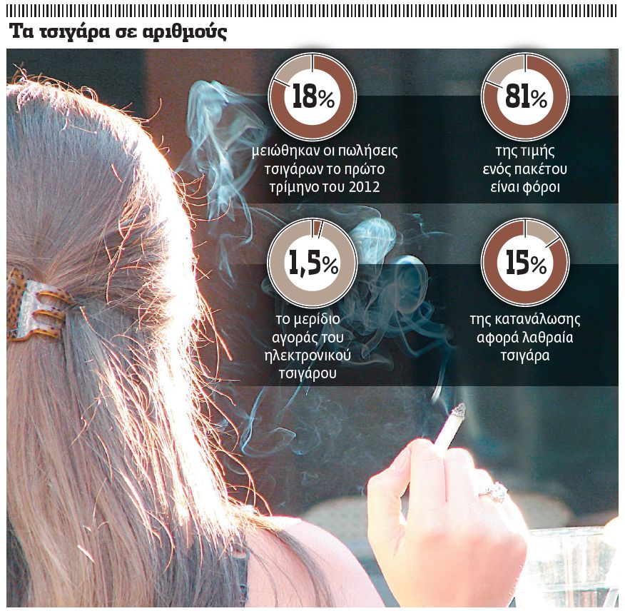 Στην Ελλάδα στα 4 ευρώ ενός ακριβού πακέτου ο φόρος είναι 3,25 ευρώ, στα 3,10 ευρώ ενός φθηνού σήματος περίπου 2 ευρώ και σε ένα πακέτο καπνού που κοστίζει 4 ευρώ (περίπου 60 τσιγάρα) ο αναλογικός φόρος για 20 τσιγάρα είναι 1,10 ευρώ. Σε σχέση με την υπόλοιπη Ευρώπη, όπου υπάρχουν τρεις φόροι για τα τσιγάρα (πάγιος, αναλογικός και ΦΠΑ), η Ελλάδα επιβάλλει πέντε(!) φόρους (πάγιος, αναλογικός, ειδικός, ΦΠΑ και μεσοσταθμικός).