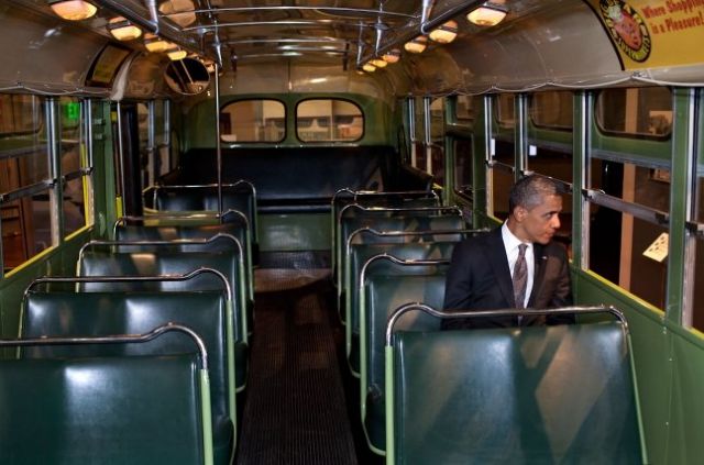 Ετσι, ο πρώτος μαύρος αμερικανός πρόεδρος αποφάσισε να κάνει μία στάση στο πλαίσιο της επίσκεψής τους στο Μίσιγκαν για να μαζέψει χρήματα για το κόμμα των Δημοκρατικών και πραγματοποίησε νοερό ταξίδι στον χρόνο επισκεπτόμενος το λεωφορείο όπου η μαύρη Αμερικανίδα Ρόζα Παρκς αρνήθηκε να παραχωρήσει τη θέση της σε μια λευκή, τον Δεκέμβριο του 1955.