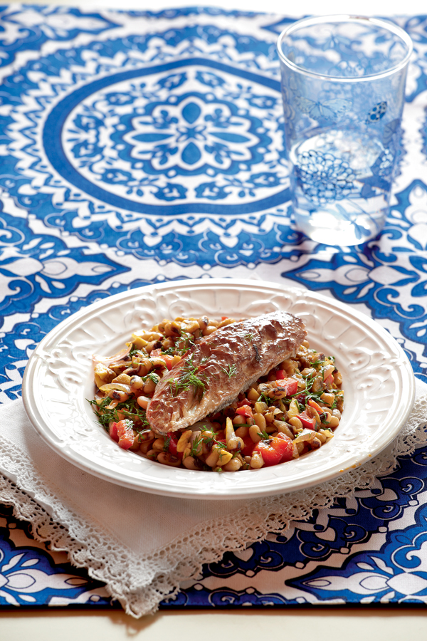 Σε μία μικρή κατσαρόλα με μπόλικο νερό και λίγο αλάτι και το δαφνόφυλλο βράζουμε τα μαυρομάτικα για περίπου 25 λεπτά, μέχρι να μαλακώσουν, χωρίς να διαλυθούν. Τα σουρώνουμε και τα βάζουμε σε μια σαλατιέρα.