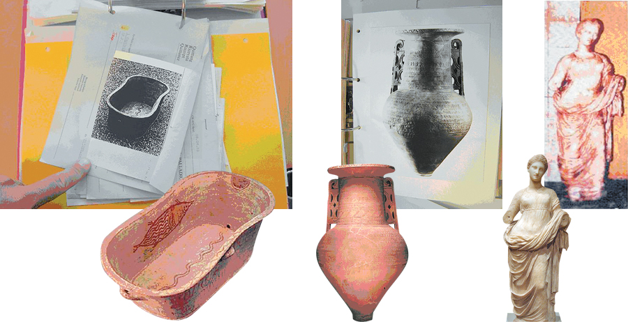 Πρόκειται για φωτογραφίες που βρίσκονταν στο αρχείο φωτογραφιών και εγγράφων του Μπεκίνα και αντίγραφά τους είχαν παραδοθεί από το 2006 στις ελληνικές αρχές. Ο πήλινος μινωικός λουτήρας του 14ου π.Χ. αιώνα με την εξαιρετική διακόσμηση, ο οποίος είχε χρησιμοποιηθεί ως σαρκοφάγος, έχει προέλευση μόνο την Κρήτη φυσικά και φέρεται να αγοράστηκε από το μουσείο επίσης το 2002. Οσον αφορά τον ροδιακό πίθο για τον οποίο το μουσείο αναφέρει «Ελλάδα, πιθανώς νησιά 650-600 π.Χ., από πηλό», πρόκειται επίσης για προϊόν λαθρανασκαφής η απόκτηση του οποίου έγινε, σύμφωνα πάντα με το μουσείο, το 2004. Πέντε φωτογραφίες του όμως είχαν βρεθεί στο αρχείο του ιταλού αρχαιοκάπηλου, ο οποίος το διακίνησε λαθραία – στοιχείο αδιάσειστο για την παράνομη εξαγωγή του από τη χώρα.