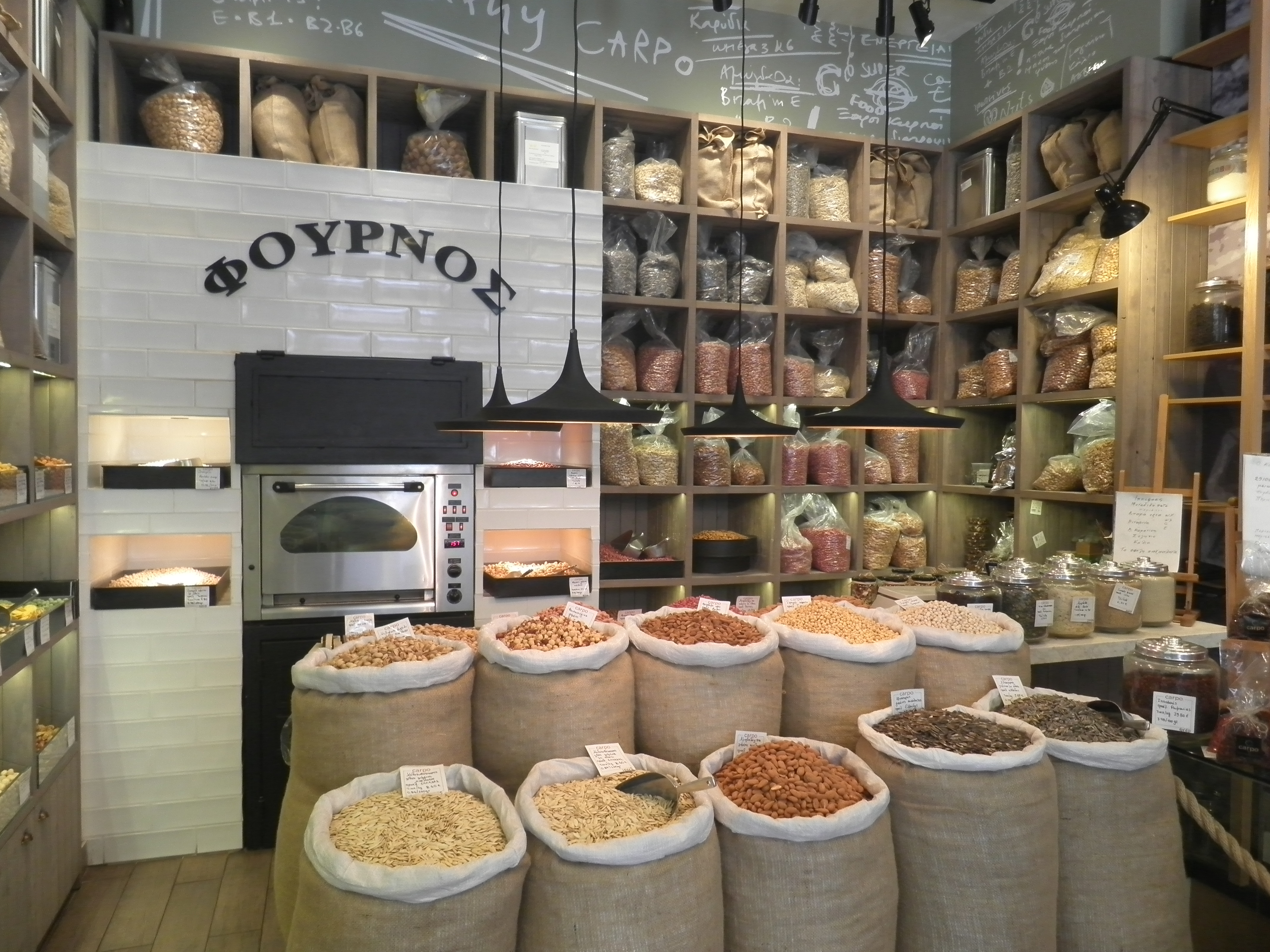 Τσουβάλια γεμάτα ξηρούς καρπούς, προθήκες με κάθε λογής αποξηραμένα φρούτα, μια βιτρίνα με σοκολάτες διαφόρων ειδών, άρωμα φρεσκοκομμένου καφέ να πλημμυρίζει την ατμόσφαιρα και ένας φούρνος να σιγοκαβουρδίζει φιστίκια συνθέτουν το σκηνικό που αντίκρισα μπαίνοντας.