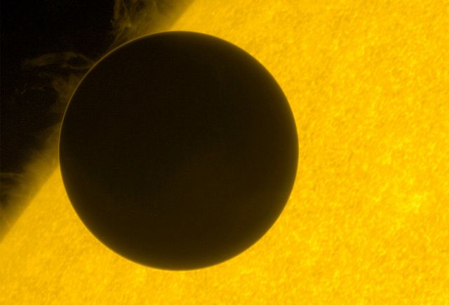 Η NASA έδωσε στη δημοσιότητα μια εντυπωσιακή φωτογραφία από το πέρασμα της Αφροδίτης μπροστά από τον Ηλιο την Τετάρτη. Η Αφροδίτη εμφανίζεται σκοτεινή αλλά σε όλο της το μεγαλείο να περνάει μπροστά από το μητρικό μας άστρο. Την φωτογραφία κατέγραψε το διαστημικό παρατηρητήριο Hinode που μελετά το μαγνητικό πεδίο του Ηλιου. Το Hinode είναι μια κοινή αποστολή της NASA και της Ιαπωνικής Υπηρεσίας Διαστήματος JAHA.