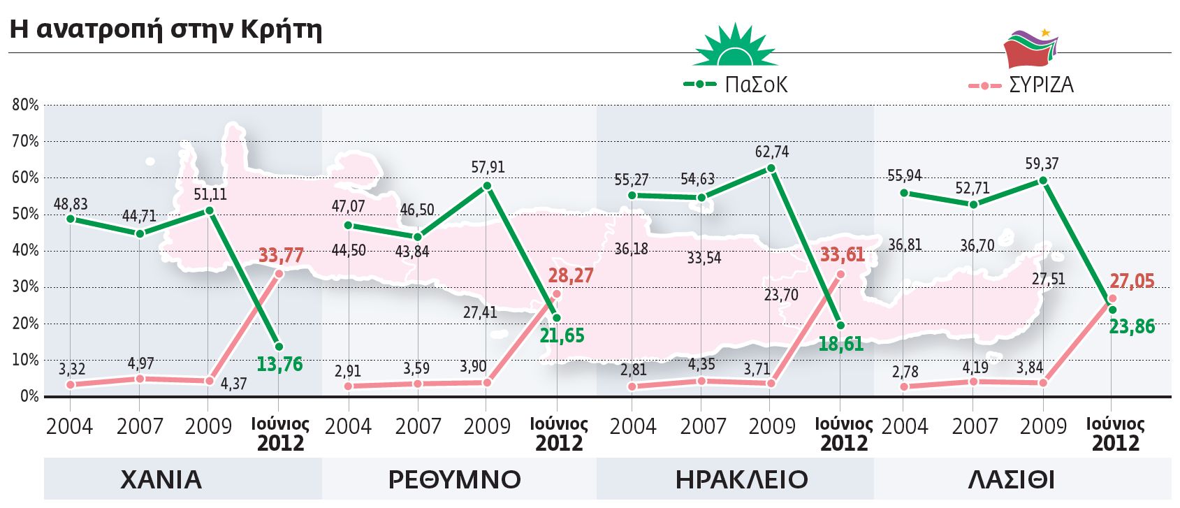 Τα ποσοστά όμως που έλαβε ο ΣΥΡΙΖΑ στην Κρήτη στην εκλογική αναμέτρηση του Ιουνίου του 2012 υπολείπονται κατά πολύ των ποσοστών που ελάμβανε συνήθως το ΠαΣοΚ καθ’ όλη τη μεταπολιτευτική περίοδο. Τα υψηλά ποσοστά του ΠαΣοΚ στη Μεγαλόνησο διατηρήθηκαν ακόμη και στην εκλογική αναμέτρηση του 2007, στην οποία το ΠαΣοΚ, παρ’ ότι διατήρησε την πρωτιά στην Κρήτη, έχασε το Ρέθυμνο. Σε αυτή την αναμέτρηση η ΝΔ που ήρθε πρώτο κόμμα πήρε το 46,50% των ψήφων και το ΠαΣοΚ το 43,84.