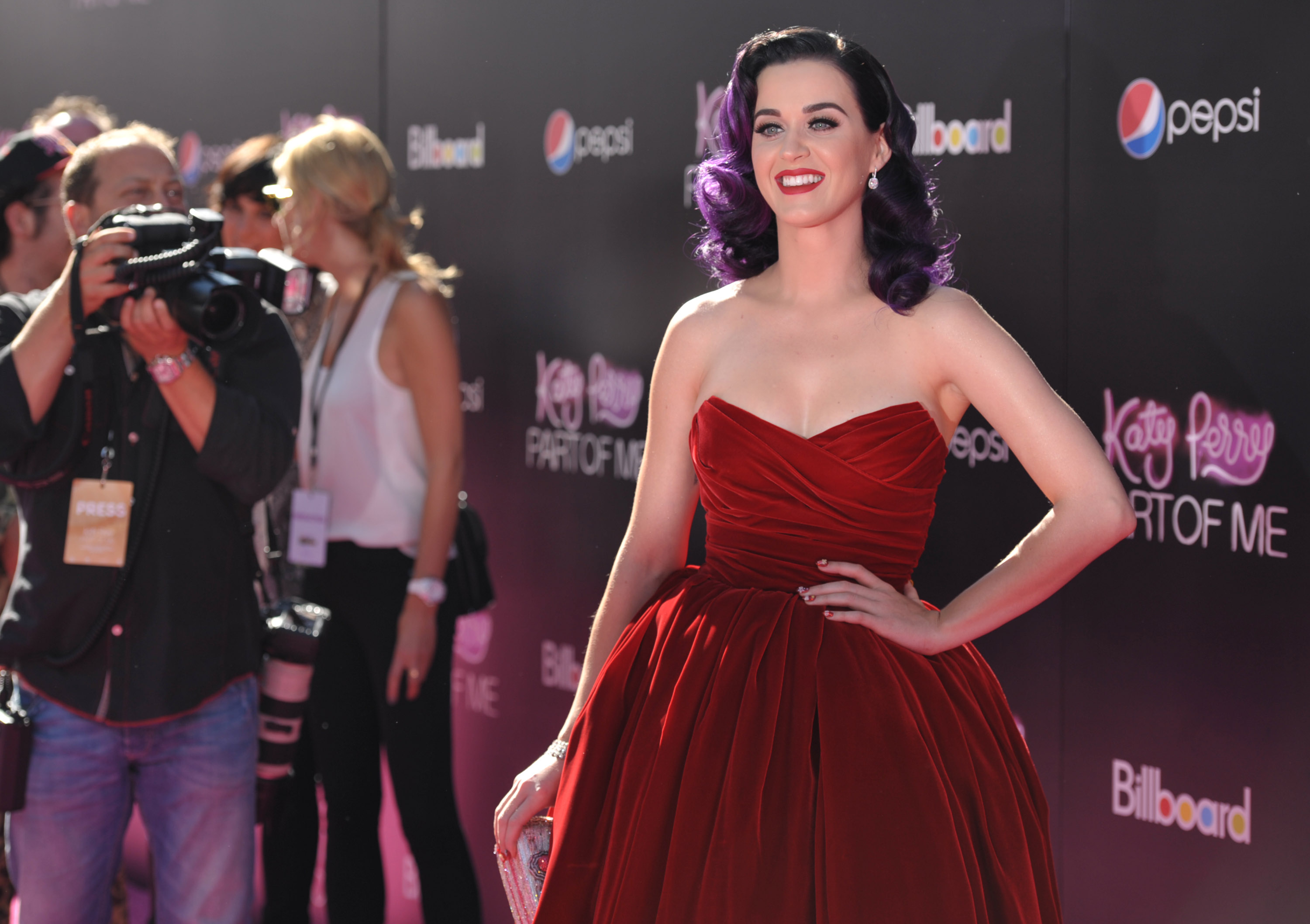 Ντυμένη με ένα κόκκινο βελούδινο στράπλες φόρεμα σε στιλ 60s, ασορτί ψηλοτάκουνες γόβες, vintage χτένισμα στα μαλλιά της και επίσης κόκκινο κραγιόν, έκανε μια άκρως εντυπωσιακή εμφάνιση, κατά την άφιξή της στο φημισμένο Grauman’s Chinese Theatre όπου έγινε η επίσημη προβολή του «Katy Perry: Part of Me».