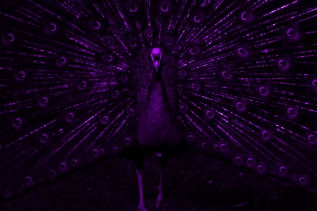 Μια από τις πιο εντυπωσιακές εικόνες της έκθεσης είναι αυτή που δείχνει το πώς βλέπει ένα θηλυκό παγώνι τα αρσενικά που φλερτάρουν μαζί του ανοίγοντας διάπλατα τα πλούσια ιριδίζοντα φτερά τους. Σύμφωνα με τους ειδικούς οι υποδοχείς των ματιών των θηλυκών συλλαμβάνουν κυρίως την υπεριώδη ακτινοβολία. Ετσι δεν βλέπουν το εντυπωσιακό πολύχρωμο θέαμα που βλέπουμε εμείς, παρά μόνο μια έντονη μωβ ιριδίζουσα απόχρωση.