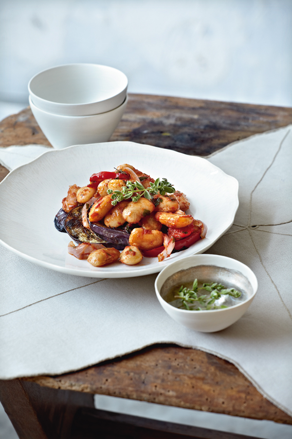 Προθερμαίνουμε τον φούρνο στους 180°C. Μεταφέρουμε το φαγητό σε ένα πυρέξ και προσθέτουμε και 1 ποτήρι από το νερό στο οποίο έβρασαν οι γίγαντες και ψήνουμε μέχρι το φαγητό να μείνει με τη σάλτσα του και αρχίζουν να ξεροψήνεται οι γίγαντες. Απλώνουμε τις μελιτζάνες στο πυρέξ και ανακατεύουμε προσεχτικά. Πασπαλίζουμε με τη ρίγανη, ψήνουμε για άλλα 10 λεπτά και σερβίρουμε με φρεσκοτριμμένο πιπέρι.