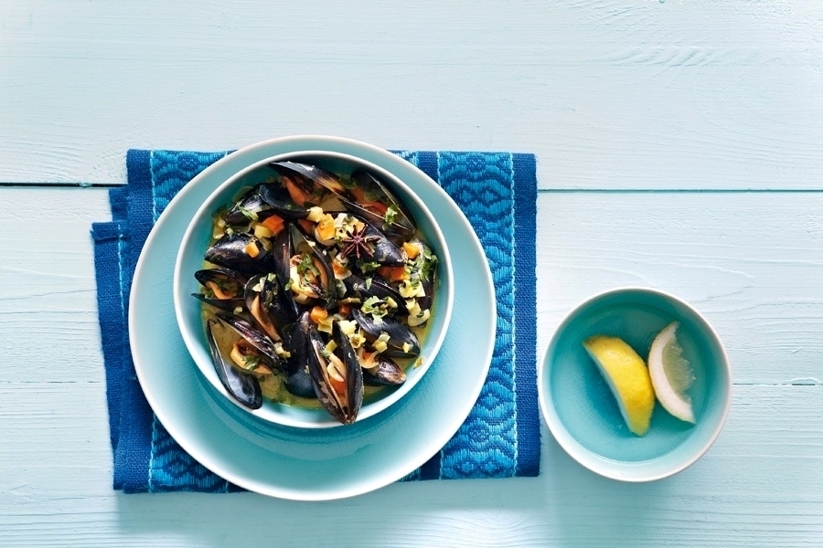 Κάτω από άφθονο τρεχούμενο νερό πλένουμε με ένα σκληρό βουρτσάκι τα μύδια και με μια απότομη κίνηση αφαιρούμε το γενάκι. Κατόπιν τα αφήνουμε σε σουρωτήρι να στραγγίξουν. Σε μια κατσαρόλα ζεσταίνουμε το λάδι και σοτάρουμε τα λαχανικά και τον γλυκάνισο για λίγα λεπτά.