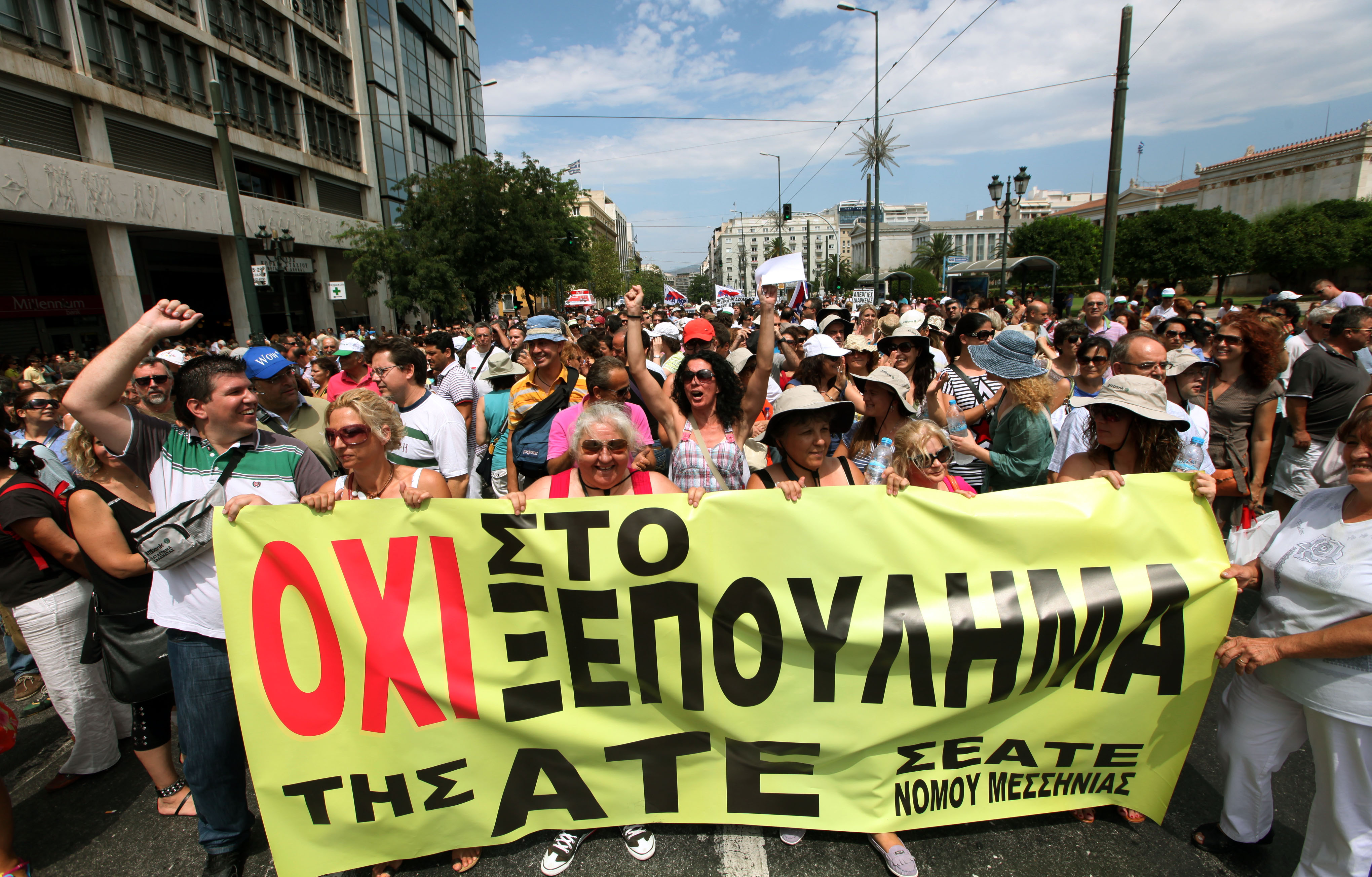 Οι εργαζόμενοι αρχικά συγκεντρώθηκαν μπροστά στο παλιό κεντρικό κτίριο της τράπεζας, ξεκίνησαν πορεία προς το υπουργείο Οικονομικών και παραμένουν στο Σύνταγμα.