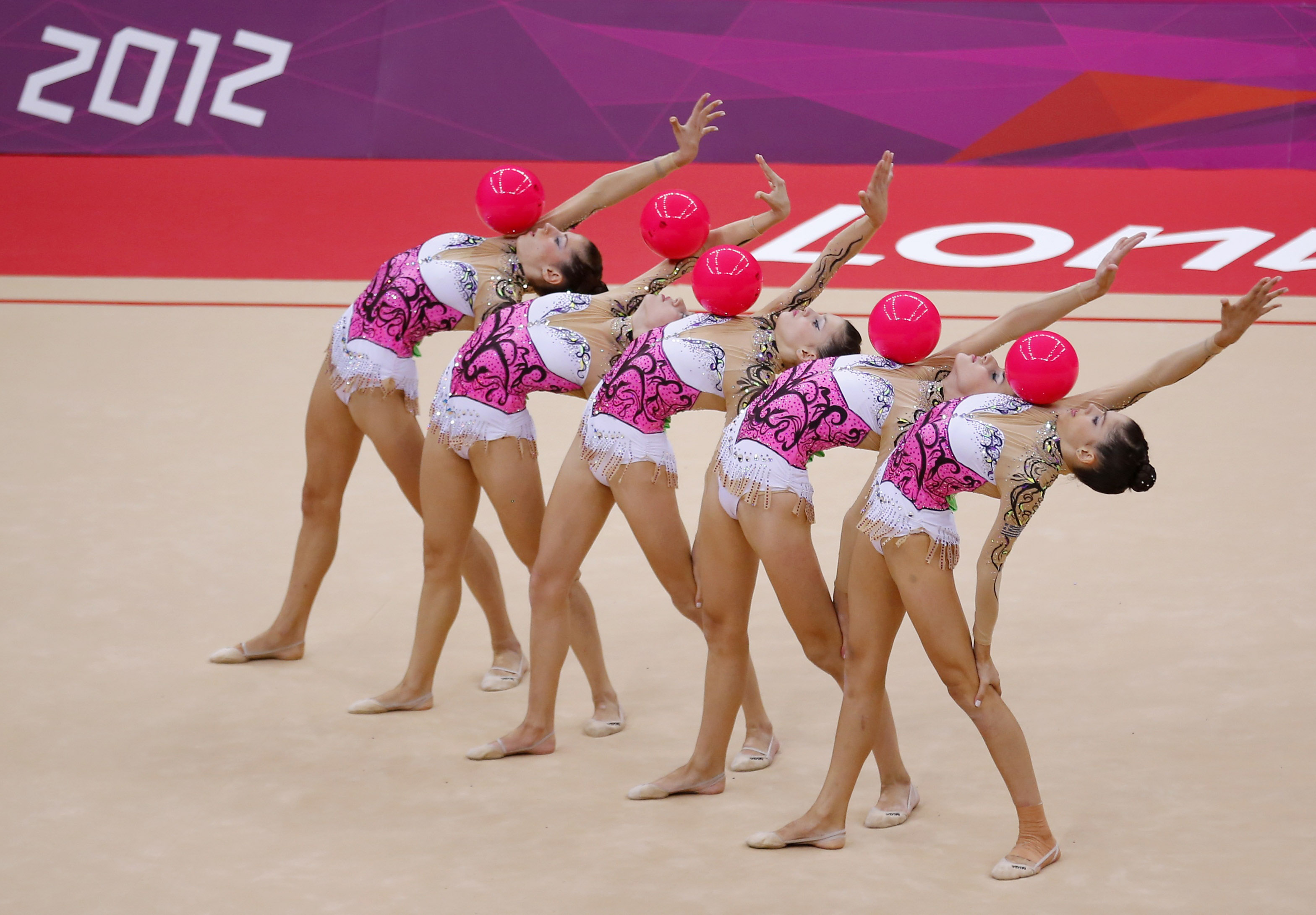 Οι Ελένη Δοϊκα, Αλεξία Κυριαζή, Ευδοκία Λουκάγκου, Σταυρούλα Σαμαρά και Μαριάνθη Ζαφειρίου εκτέλεσαν το πρόγραμμά τους στις τρεις κορδέλες και τα δύο στεφάνια, με μουσική υπόκρουση το ισπανικό κομμάτι «Nada puede dormir» του Βιθέντε Αμίγο. Συγκεκριμένα, τα κορίτσια του ανσάμπλ έλαβαν 8.650 βαθμούς στη δυσκολία, στο καλλιτεχνικό μέρος συγκέντρωσαν 8.900 και στην εκτέλεση 8.450 βαθμούς από τους κριτές.