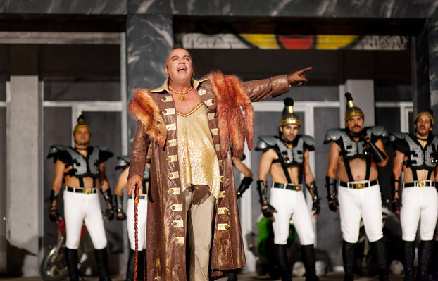 Αποστεγνωμένες κωμικές παρουσίες, ο Τάκης Παπαματθαίου και ο Πυγμαλίων Δαδακαρίδης ως ντουέτο δούλων ανοίγουν με τα χίλια ζόρια, χωρίς καθόλου μπρίο, την παράσταση, ενώ τα πράγματα δεν βελτιώνονται με την εμφάνιση του Πέτρου Φιλιππίδη: από μπακάλης της διαφήμισης σε αλλαντοπώλης του θεάτρου, ο ηθοποιός εξασφάλισε, φαντάζομαι, μια προφανή, ασφαλή και οικεία στο τηλεοπτικό κοινό μετάβαση, σερβίροντας τα «αστεία» με δεκατρία κλεισίματα ματιού κάθε φορά, εξουδετερώνοντας κάθε προσδοκία αιφνιδιασμού και ανοίγοντας διάπλατα την πόρτα στον κορεσμό.