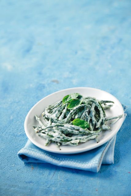 Ρίχνουμε τα αμπελοφάσουλα σε μια μεγάλη κατσαρόλα με αλατισμένο νερό που κοχλάζει και τα βράζουμε για περίπου 10 λεπτά από τη στιγμή που θα ξαναπάρει βράση το νερό ή μέχρι να γίνουν όσο μαλακά θέλουμε. Τα σουρώνουμε και τα μεταφέρουμε σε ένα μπολ με νερό και παγάκια για να διατηρήσουν ζωντανό το χρώμα τους. Στη συνέχεια τα στραγγίζουμε και τα αδειάζουμε σε μια μεγάλη σαλατιέρα. Στο μεταξύ χτυπάμε στο multi τον βασιλικό, το σκόρδο, το ελαιόλαδο, το γιοαύρτι, το ξίδι και το αλατοπίπερο μέχρι να έχουμε ένα ομοιογενές μείγμα. Περιχύνουμε τα αμπελοφάσουλα με τη σάλτσα γιαουρτιού και τα αφήνουμε σκεπασμένα με διάφανη μεμβράνη στο ψυγείο για περίπου 30 λεπτά προτού τα σερβίρουμε.