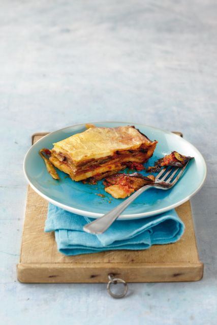 στρώση εναλλάξ τα λαχανικά απλώνοντας ενδιάμεσα τη σάλτσα, μέχρι να τελειώσουν τα υλικά. Πάνω από την τελευταία στρώση σάλτσας πασπαλίζουμε την υπόλοιπη φρυγανιά και στρώνουμε τις φέτες κασεριού.