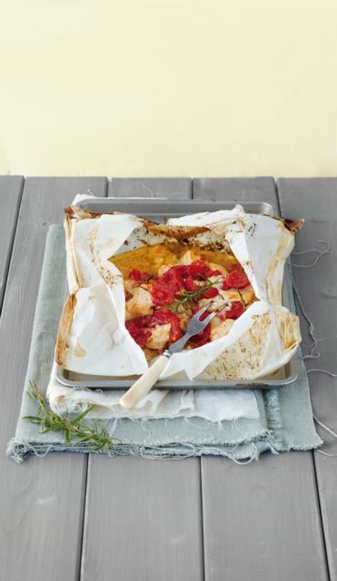 Βάζουμε σε μια λεκάνη το κοτόπουλο, το σκόρδο, το ελαιόλαδο, τον χυμό των λεμονιών, την γραβιέρα, τις ντομάτες, το δεντρολίβανο και αλατοπίπερο. Τα ανακατεύουμε και αφήνουμε το κοτόπουλο να μαριναριστεί για 10 λεπτά. Προθερμαίνουμε τον φούρνο 180°C. Μεταφέρουμε όλο το μείγμα σε λαδόκολλα ή αλουμινόχαρτο, διπλώνουμε καλά και ψήνουμε για 20-25 λεπτά. Σερβίρουμε το κοτόπουλο αμέσως όπως είναι στη φουσκωμένη λαδόκολλα.