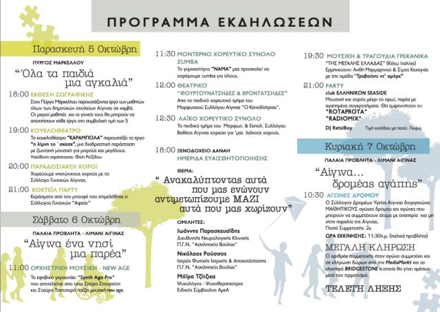 Αυτό θα είναι το πρόγραμμα του τριημέρου που με τίτλο «Ταιριάζουμε στην Αίγινα» πραγματοποιείται στο νησί του Σαρωνικού στις 5, 6 και 7 Οκτωβρίου 2012. Στόχος του τριημέρου είναι η ευαισθητοποίηση της κοινωνίας _ τοπικής και όχι μόνο _ απέναντι στα αδύνατα μέλη της και τις οικογένειές τους.