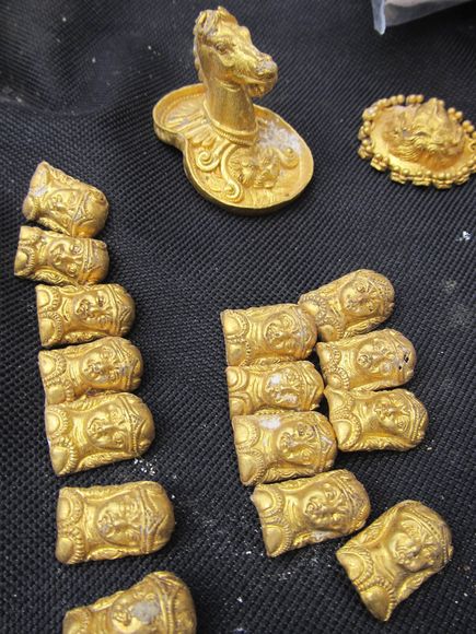 Ως τότε όμως υπάρχει το πραγματικό εύρημα, που είναι ένας εντυπωσιακός χρυσός θησαυρός αποτελούμενος από τιάρες, δακτυλίδια, καρφίτσες και άλλα, βάρους1,5 κιλού. Οι αρχαιολόγοι εντόπισαν μάλιστα τα κατάλοιπα ενός ξύλινου κιβωτίου μέσα στο οποίο βρίσκονταν απανθρακωμένα οστά και ο θησαυρός, κατά πάσα πιθανότητα τυλιγμένος σε χρυσοκέντητο ύφασμα, δεδομένου ότι βρέθηκαν επίσης χρυσοκλωστές.