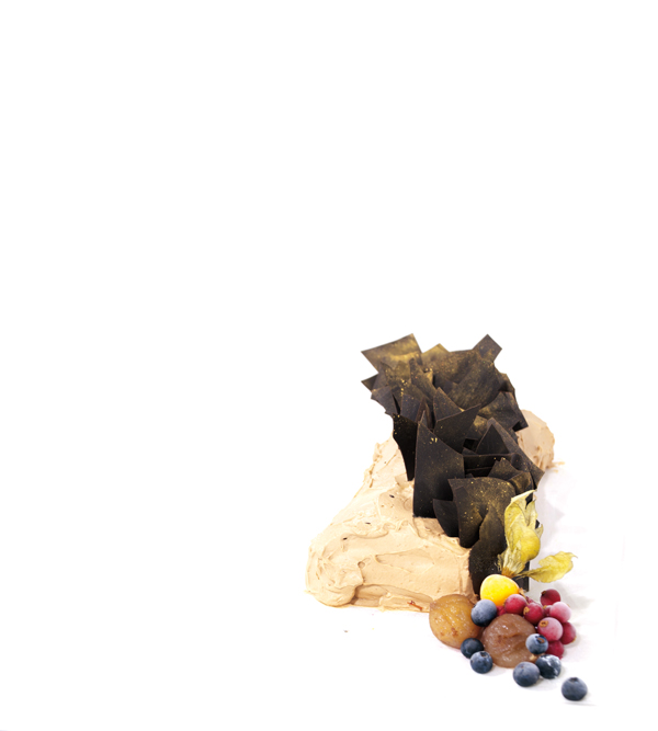 - Βγάζουµε το µπισκουί από το ρυζόχαρτο και το τοποθετούµε σε ένα καινούργιο. Απλώνουµε τη µους κάστανο σε όλη την επιφάνεια του µπισκουί ισόπαχα.