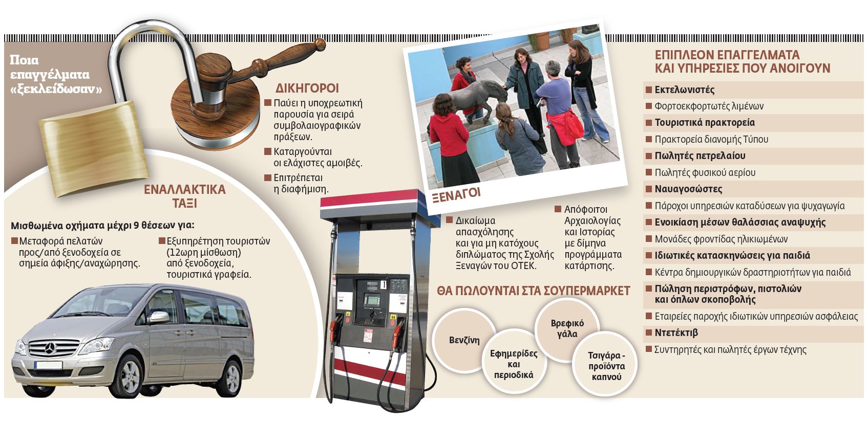 Νέες δυνατότητες ανοίγονται σε μια βεντάλια δραστηριοτήτων, από τους ξεναγούς και τη νέα αγορά των εναλλακτικών ταξί κάτω των δέκα θέσεων ως τις δυνατότητες που ανοίγονται στον τομέα του λιανεμπορίου και των καυσίμων, με αναμενόμενα οφέλη και για τους καταναλωτές από την πτώση των τιμών. Η τρόικα επέβαλε στην κυβέρνηση την έκδοση ως τις 31.12.2012 όλων των απαιτούμενων υπουργικών αποφάσεων για το άνοιγμα δεκάδων επιπλέον επαγγελμάτων και την άρση των περιορισμών σε πολλά άλλα. Οι αλλαγές που θα επέλθουν μόλις εφαρμοστεί πλήρως και μέχρι τέλους το άνοιγμα των επαγγελμάτων θα μεταμορφώσουν τη λειτουργία πολλών κλάδων της ελληνικής οικονομίας.