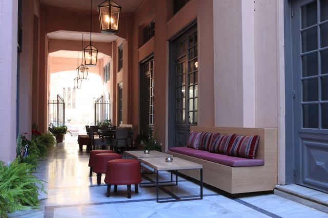 Ξύλινη μπάρα, μαρμάρινα δάπεδα σκακιέρα, μαυροπίνακας, αστική εσάνς. Ενδιαφέρον το αποτέλεσμα στη διακόσμηση με το αίθριο και τη στοά-αυλή να συμμετέχουν στο ατμοσφαιρικό παιχνίδι που στήθηκε στο εντυπωσιακό κτίριο του 1825, στην καρδιά της Αθήνας.