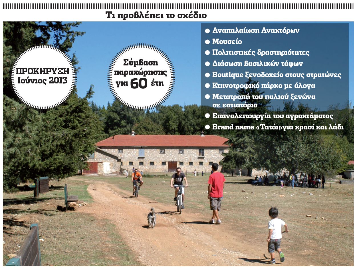 Η έκταση των 45.000 στρεμμάτων περιλαμβάνει τα ιστορικά κτίρια της παλαιάς βασιλικής οικογένειας που κρύβουν θησαυρούς (έργα τέχνης και κειμήλια, τα οποία αποθηκεύτηκαν και φυλάσσονται από το τέλος του 2012) αλλά και εγκαταλειμμένα βουστάσια, αμπελουργεία, δασικές εκτάσεις και άλλες εγκαταστάσεις. Οπως λέει στέλεχος του ΤΑΙΠΕΔ, «παρ’ ότι τα κτίρια βρίσκονται σε απελπιστική κατάσταση συγκεντρώνουν 140.000 επισκέπτες τον χρόνο και ο χώρος θα μπορούσε να αποτελέσει πόλο έλξης τουριστών».