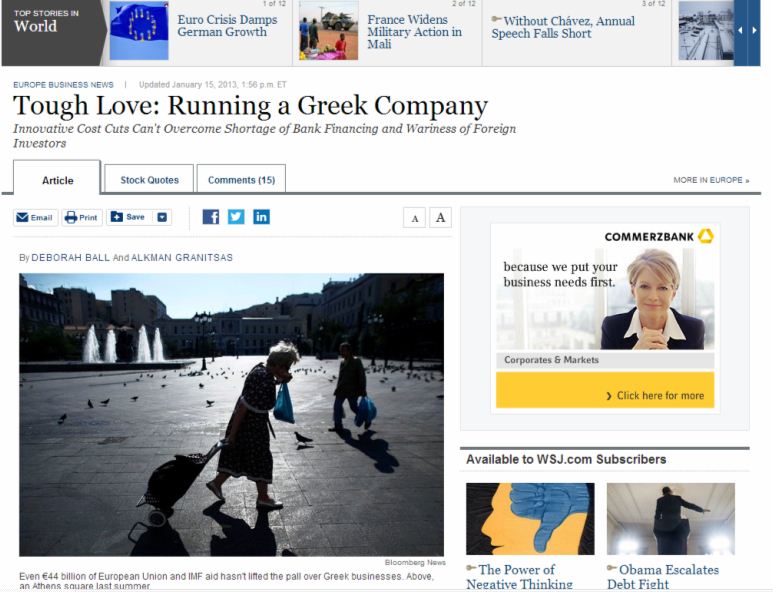 «Τα προβλήματα της Ελλάδας έδωσαν το τελειωτικό χτύπημα στην επιχειρηματική κοινότητα της χώρας», γράφει χαρακτηριστικά η εφημερίδα. «Η ύφεση συνεχίζεται για έκτη χρονικά εφέτος. Με τις ελληνικές τράπεζες χρεοκοπημένες, το 70% των ελληνικών επιχειρήσεων δηλώνουν, σύμφωνα με το ελληνικό Ινστιτούτο Εμπορίου και Υπηρεσιών, ότι δεν έχουν πρόσβαση σε τραπεζικό δανεισμό. Την ίδια ώρα, οι ξένοι πάροχοι και οι πελάτες κόβουν τους δεσμούς τους με τις ελληνικές εταιρίες», υπογραμμίζει το δημοσίευμα.