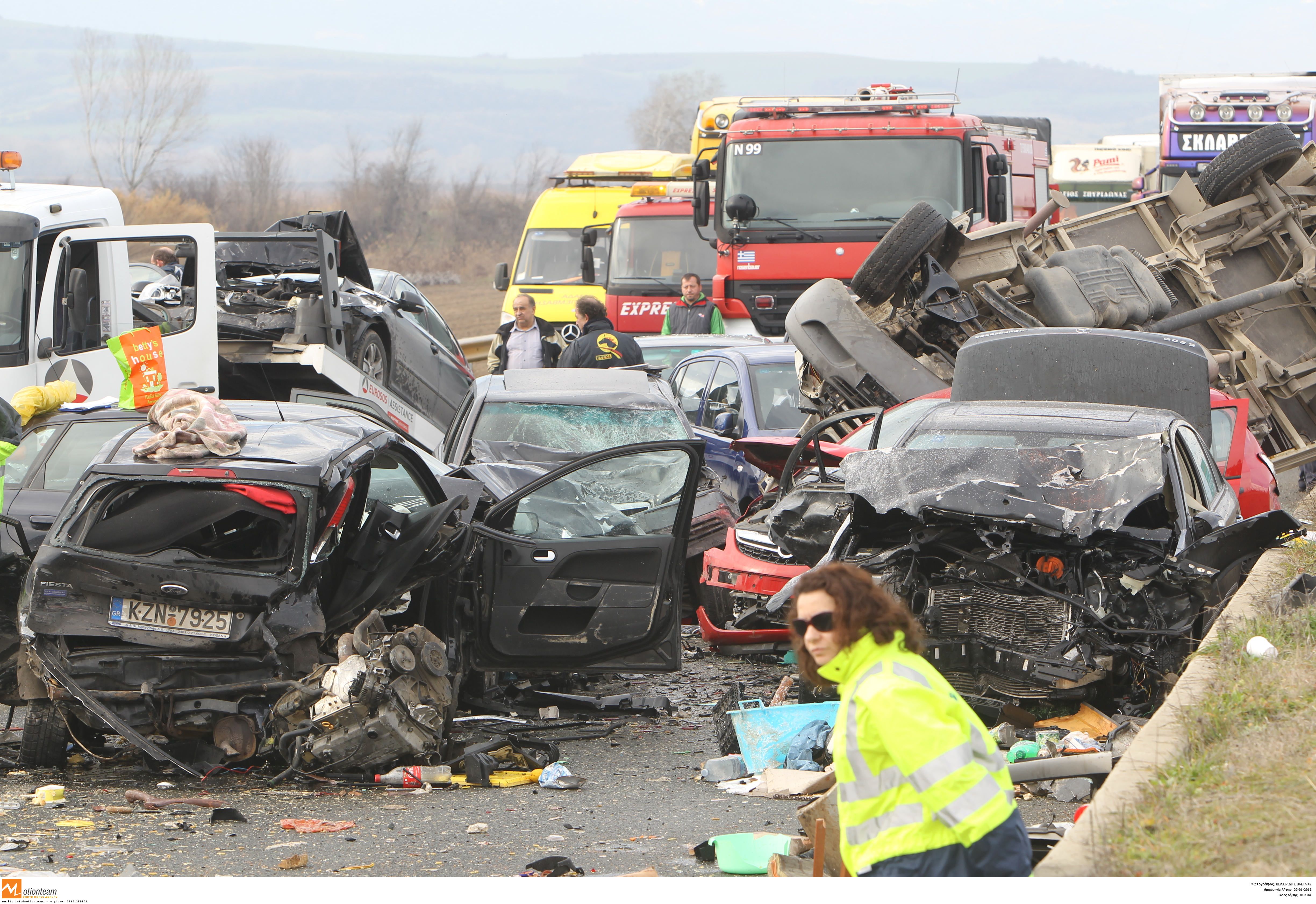 Από τα αυτοκίνητα ανασύρθηκε μια γυναίκα νεκρή και άλλοι δύο σοβαρά τραυματίες, ενώ άλλα 21 άτομα, ανάμεσα τους τρία παιδιά, τραυματίστηκαν ελαφρά. Τα παιδιά μετά την παροχή των πρώτων βοηθειών εξήλθαν από το νοσοκομείο. Από τους τραυματίες οι 13 μεταφέρθηκαν σε νοσοκομείο της Βέροιας και οι υπόλοιποι σε διάφορα νοσοκομεία της Θεσσαλονίκης.