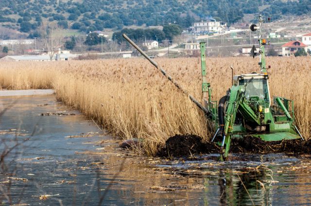 Όπως εξηγεί ο κ. Φίλιος, το επίμαχο σημείο βρίσκεται πίσω από το τεχνητό ανάχωμα που είχε κατασκευαστεί το 1970 προκειμένου να προστατευθούν οι αγροτικές γαίες. «Το ανάχωμα έχει προκαλέσει πολλά προβλήματα αλλά δεν ξέρουμε τι θα συμβεί αν το σπάσουμε, διότι δεν υπάρχουν σχετικές μελέτες. Πίσω από αυτό έχει δημιουργηθεί ένας καλαμιώνας 3.000 στρεμμάτων. Είπαμε να κόψουμε το 6%, δηλαδή 64 στρέμματα, και να δημιουργήσουμε έναν στίβο ελεύθερο για αθλήματα, χρήση η οποία επιτρέπεται και από το σχέδιο ΠΔ για τη λίμνη που μας έχει σταλεί για διαβούλευση. Αυτός ο καλαμιώνας δημιουργήθηκε τα τελευταία 10 χρόνια επειδή κανείς δεν καθάριζε την περιοχή. Έχουμε παλαιότερες φωτογραφίες που αποδεικνύουν ότι ήταν πολύ μικρότερος σε έκταση. Επί αιώνες οι αγρότες έκαιγαν τα καλάμια και δημιουργούσαν εκεί βοσκοτόπια για τα κοπάδια τους» αναφέρει.