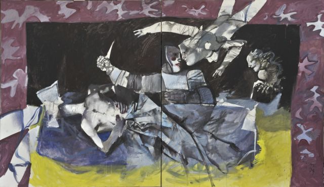 Τι ενώνει τον Δημήτρη Μυταρά με τον Θόδωρο Αγγελόπουλο, στη μνήμη του οποίου ο ζωγράφος αποφάσισε να δωρίσει στην Εθνική Πινακοθήκη το δίπτυχο «Ο φόνος», φιλοτεχνημένο το 1994; Τα φοιτητικά τους χρόνια στο Παρίσι της δεκαετίας του ’60. Σπουδαστής Γαλλικής Φιλολογίας, Φιλμογραφίας και Εθνολογίας ο Αγγελόπουλος, σπουδαστής Σκηνογραφίας ο Μυταράς, εργάζονταν στη φοιτητική εστία για να βγάλουν το χαρτζιλίκι τους και να αντεπεξέλθουν στις οικονομικές απαιτήσεις των σπουδών τους –να σημειωθεί πως, παρ’ ότι ο Μυταράς σπούδαζε με υποτροφία του ΙΚΥ, τα χρήματα δεν έφθαναν για να καλύψουν τις ανάγκες του. «Θυμηθήκαμε τα παλιά με συγκίνηση μια μέρα που ξανασυναντηθήκαμε μετά από πολλά χρόνια» μας είπε ο Δημήτρης Μυταράς. «Και ο Θόδωρος μου ζήτησε ένα έργο μου, διότι έλειπε από τη συλλογή του. Του υποσχέθηκα ότι θα του στείλω το δίχως άλλο. Και την επόμενη μέρα έμαθα ότι σκοτώθηκε. Αποφάσισα ωστόσο εγώ να του το “στείλω”». Αυτή είναι η ιστορία της δωρεάς του έργου «Ο φόνος» στην Εθνική Πινακοθήκη. Ενα έργο τεραστίων διαστάσεων (4×4 μέτρα), για το οποίο το πρώτο που ρώτησε ο ζωγράφος ήταν… αν χωράει. Και μόλις πήρε θετική απάντηση από τη διευθύντρια της Εθνικής Πινακοθήκης Μαρίνα Λαμπράκη-Πλάκα, έκανε τη σκέψη του πράξη.