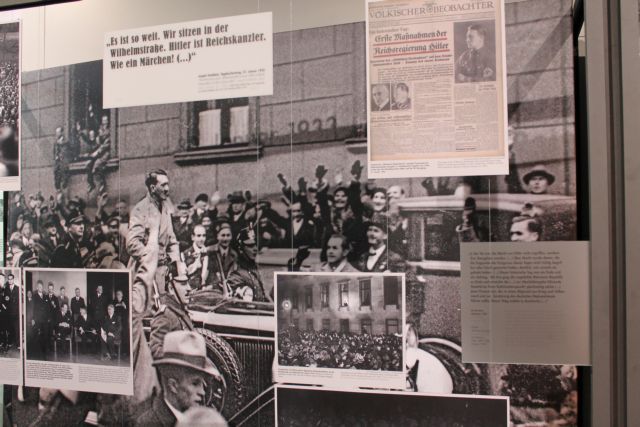 Οποιος στέκεται λοιπόν στην είσοδο του μουσείου και κοιτάζει προς την κατεύθυνση του υπουργείου έχει μπροστά του, σε απόσταση περίπου 70 μέτρων, συμπυκνωμένη τη γερμανική τραγωδία 80 χρόνων –και ταυτόχρονα την αντίστοιχη ευρωπαϊκή. Τις αρχικές λεπτομέρειές της τις βλέπει κανείς στο ίδιο το μουσείο: τον Χίτλερ να μορφάζει σαν παλαβός. Τα πλήθη να εκστασιάζονται μπροστά του. Τα τάγματα εφόδου να σπάνε τα γραφεία των οργανώσεων του εργατικού κινήματος ή να τοποθετούν πινακίδες στις προσόψεις εβραϊκών καταστημάτων με την επιγραφή «Μην αγοράζετε από εβραϊκά μαγαζιά».