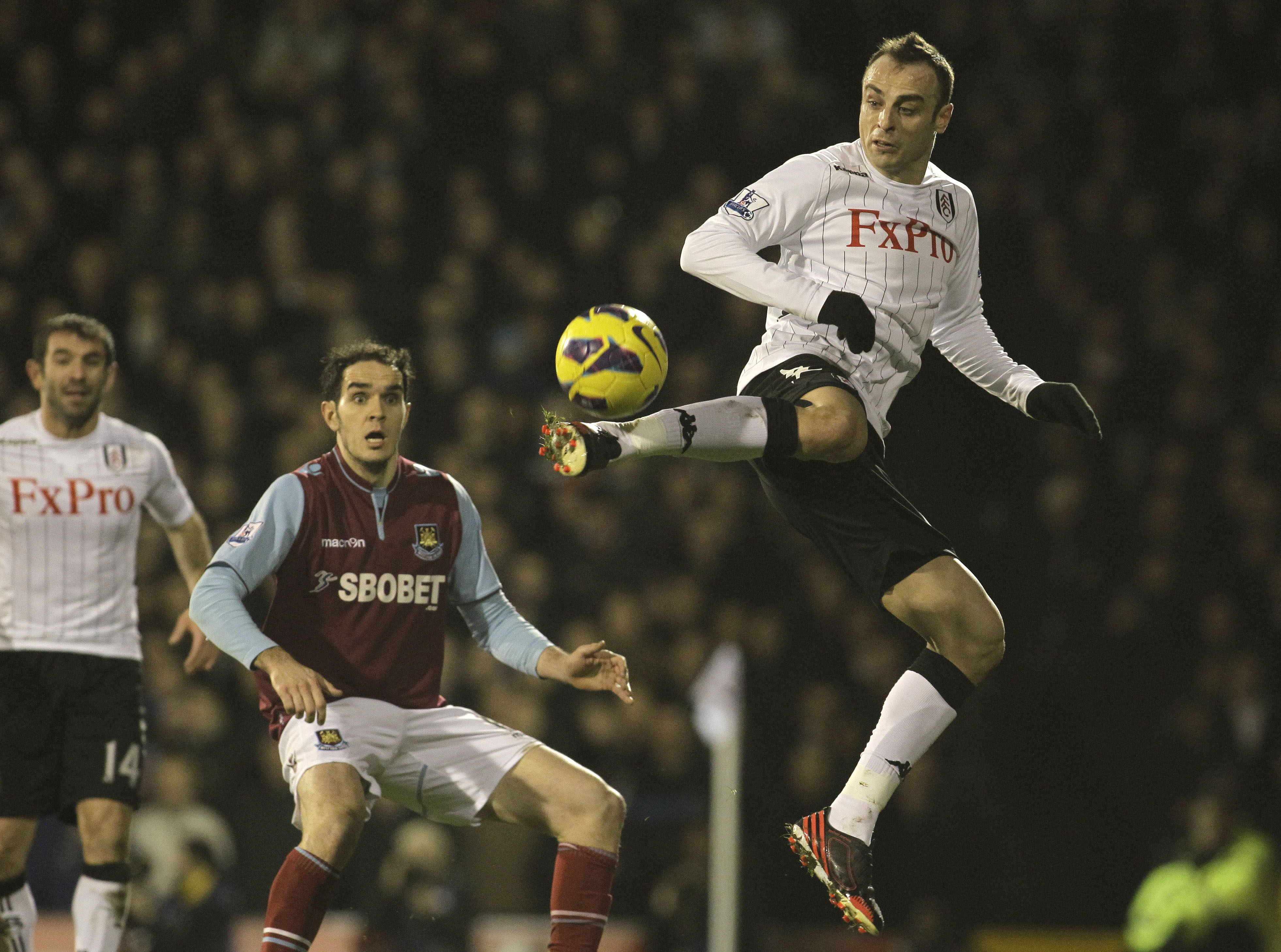 Fulham's Dimitar Berbatov, right, jumps to control the ball during their English Premier League soccer match against West Ham United at Craven Cottage, London, Wednesday, Jan. 30, 2013. (AP Photo/Sang Tan) (File: Britain Soccer Premier League.JPEG-07881.jpg )