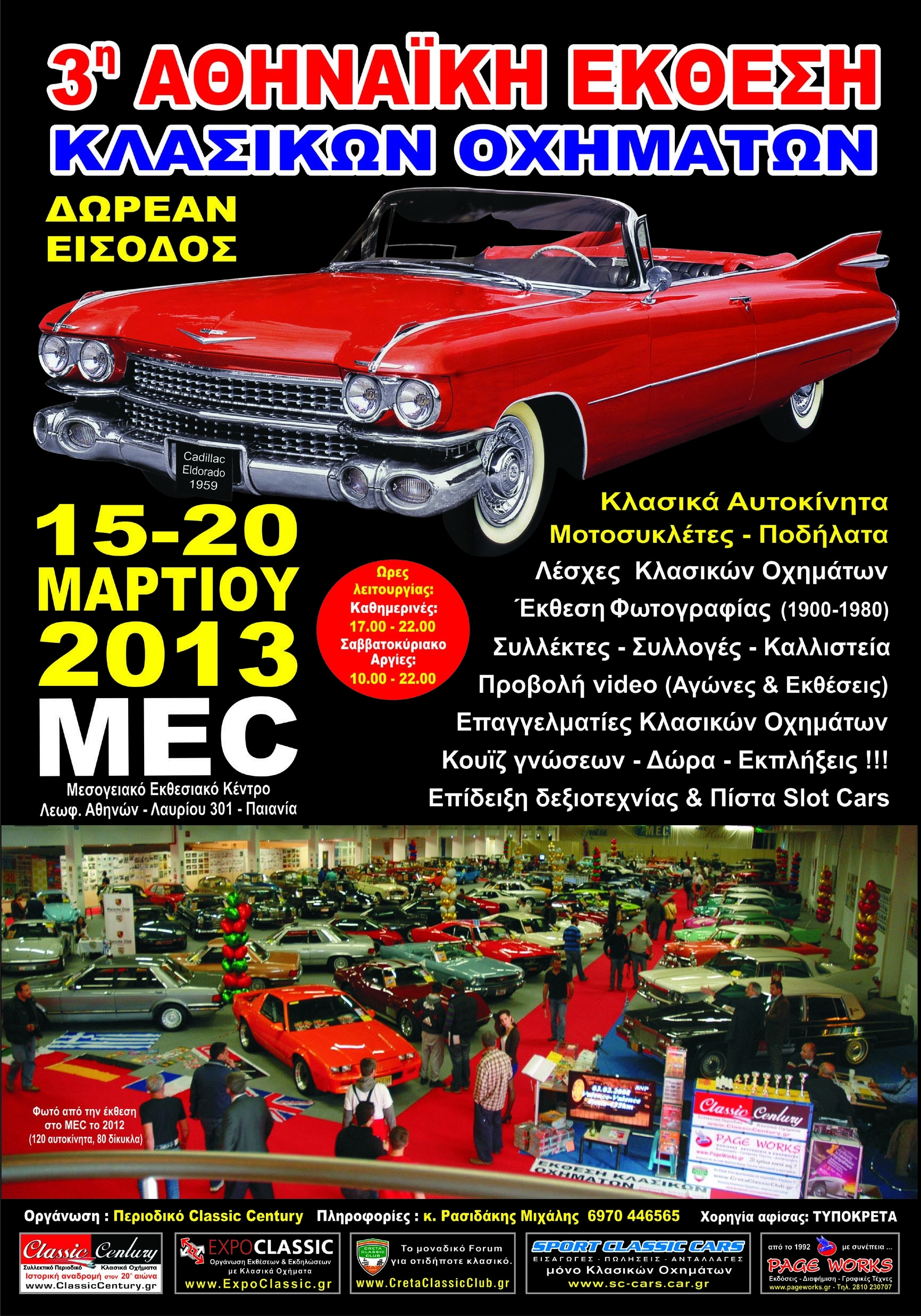 {{{ moto }}}Πέρα εξάλλου από τις εντυπωσιακές αντίκες των τεσσάρων και δύο τροχών, στο πολιτιστικό αυτό γεγονός το οποίο διοργανώνεται για τρίτη φορά στην Αθήνα από το εξαμηνιαίο συλλεκτικό περιοδικόClassicCentury, οι επισκέπτες θα θαυμάσουν σπάνιες εικόνες από την αρχή του προηγούμενου αιώνα που συνδέονται με τη μετακίνηση του ανθρώπου της εποχής. Παράλληλα, στον χώρο θα λειτουργούν διάφορα περίπτερα επαγγελματιών που σχετίζονται με τη μηχανοκίνηση ενώ όσοι ενδιαφέρονται να μάθουν περισσότερα για τον τρόπο διάσωσης-συντήρησης ενός κλασικού αυτοκινήτου θα έχουν την ευκαιρία να παρακολουθήσουν τις επιδείξεις των ειδικών.«Φυσικά, δεν θα λείψουν οι προβολές βίντεο με ράλι, καλλιστεία οχημάτων, αγώνεςslotcars»όπως σημειώνει και ο εκδότης του Classic Century και διοργανωτής της έκθεσης Μιχάλης Ρασιδάκης ο οποίος θυμίζει ότι η είσοδος είναι δωρεάν ώστε«να συμμετάσχουν όλοι, λάτρεις του αυτοκινήτου και μη, σε αυτό το μοναδικό πολιτιστικό γεγονός καθώς πέρα από την ιστορία των τροχών διηγείται την ιστορία της καθημερινής μετακίνησης αλλά και μιας ιδιαίτερης τέχνης και τεχνικής που χαρακτηρίζει τα κλασικά οχήματα».