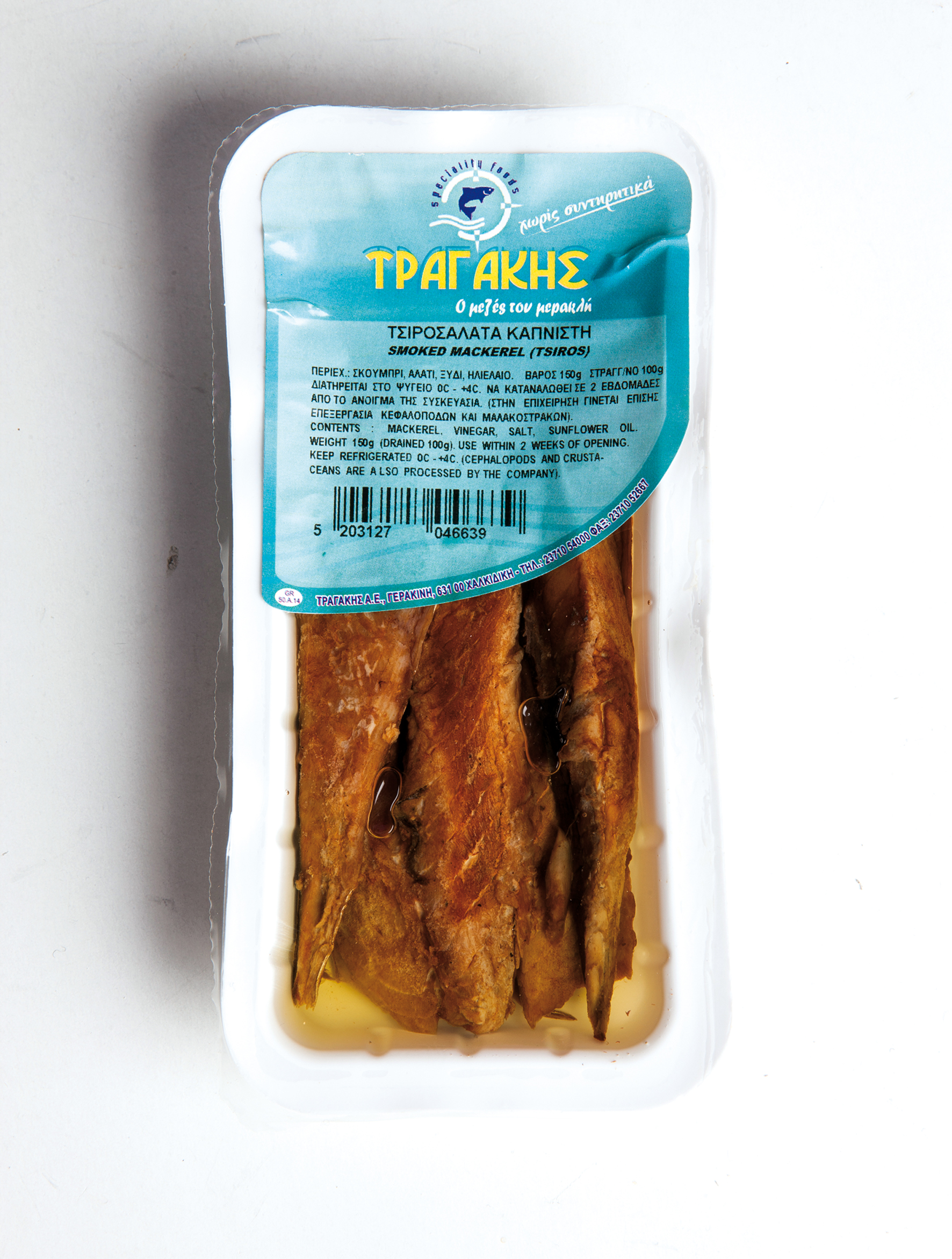 Τσιροσαλάτα καπνιστή Τραγάκη, ένας νόστιµος µεζές για ούζο και τσίπουρο. Παρασκευάζεται στη Γερακινή Χαλκιδικής από µια επιχείρηση µε όνοµα στους εκλεκτούς ψαροµεζέδες, €3/100 γρ.