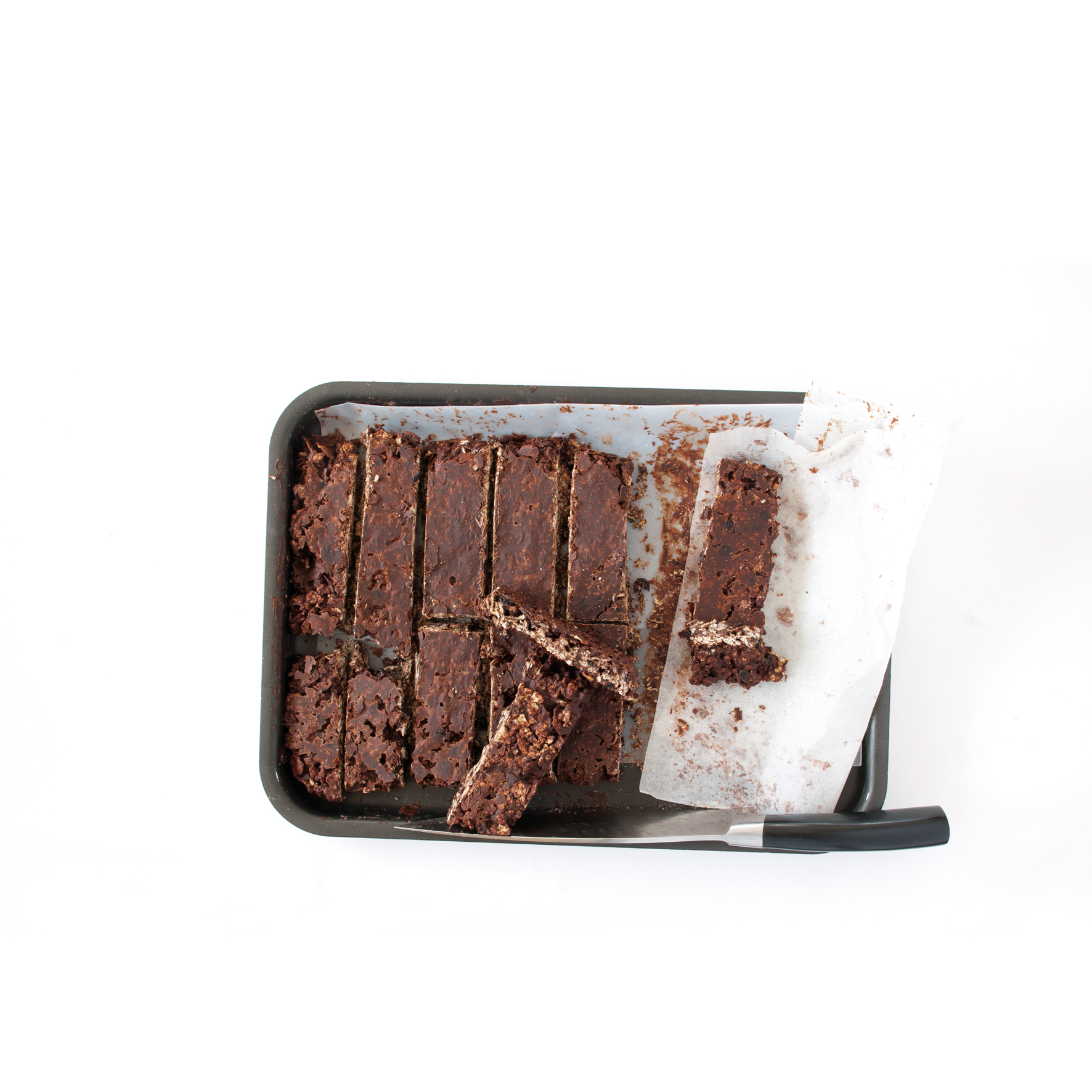 Στρώνουµε ένα ταψί µε αντικολλητικό χαρτί και απλώνουµε το µείγµα, φροντίζοντας να έχει το ίδιο πάχος παντού. Αφήνουµε στο ψυγείο για 30 λεπτά να παγώσει.