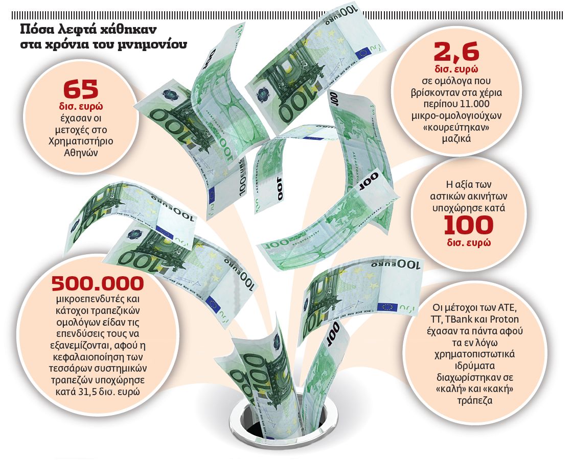 Απώλειες 185 δισ. ευρώ εμφανίζουν στα χρόνια του μνημονίου οι αξίες στην Ελλάδα με ό,τι αυτό σημαίνει για την επίπτωση στα νοικοκυριά. Μπορεί ο φόβος για την τύχη ακόμη και των καταθέσεων στην ευρωζώνη και στην Ελλάδα να έχει πλέον ενταθεί, εν τούτοις περίπου 11.000 έλληνες μικρο-ομολογιούχοι είδαν ήδη πρώτοι πριν λίγο καιρό τις τοποθετήσεις τους στα ασφαλή ομόλογα του Ελληνικού Δημοσίου να εξατμίζονται σε μία νύχτα. Οι συνολικά 900.000 επενδυτές του Χρηματιστηρίου της Αθήνας, είδαν τις τοποθετήσεις από το τελευταίο υψηλό πριν την υπογραφή του μνημονίου να καταβαραθρώνονται καθώς οι ζημίες στις ελληνικές μετοχές διαμορφώθηκαν στα 65 δισ. ευρώ με τις μετοχές των τραπεζών να υποχωρούν ακόμη και κατά 98%. Με τη χώρα μας για έκτη συνεχή χρονιά σε ύφεση, η αξία των αστικών ακινήτων υποχωρεί κατά 100 δισ. ευρώ, ενώ οι κατάρρευση των ομολόγων οδήγησε σε απώλειες για μικρο-ομολογιούχους και θεσμικούς επενδυτές που ξεπερνούν τα 20 δισ. ευρώ.