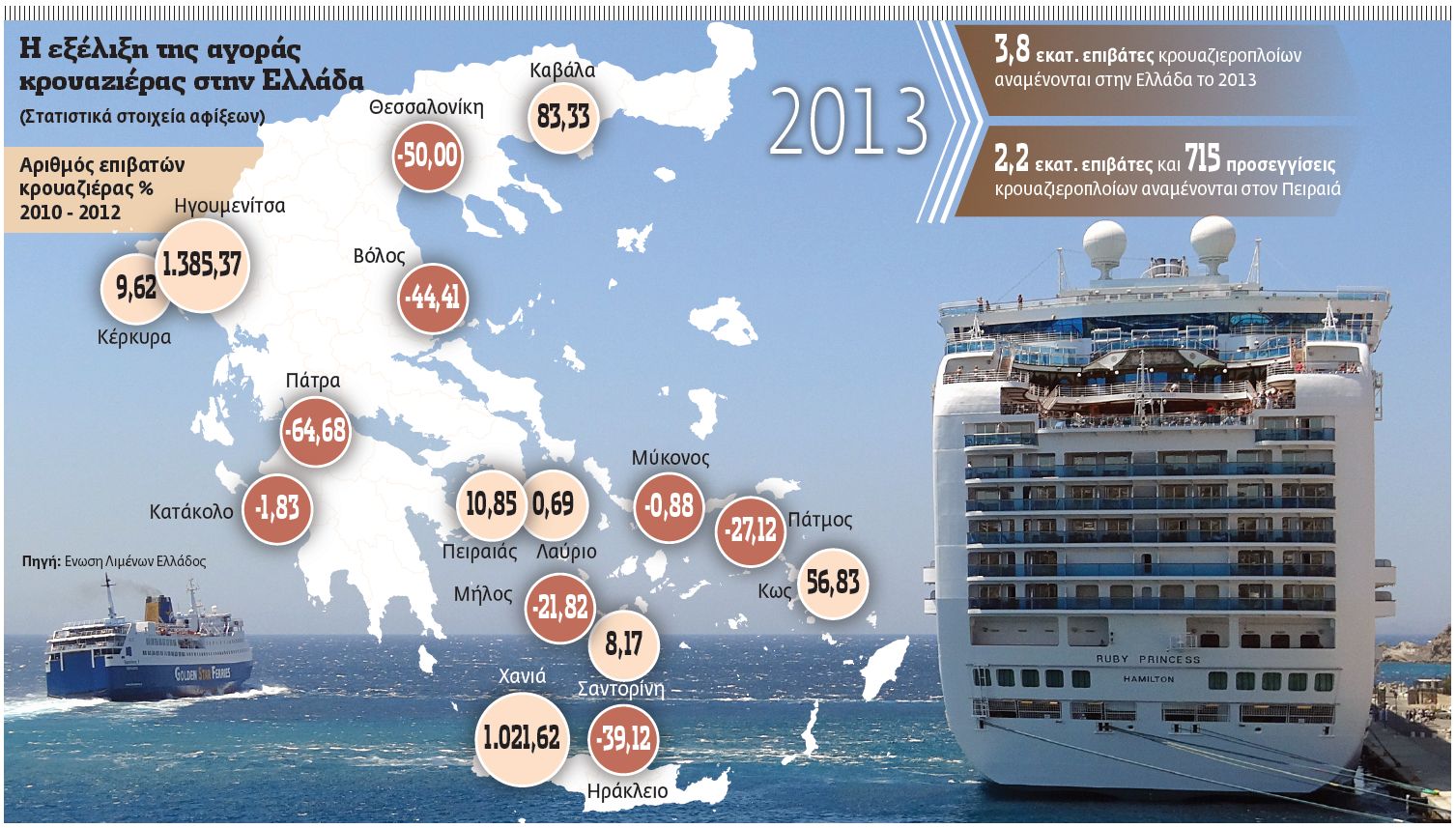 Σύμφωνα με τα στοιχεία του Οργανισμού Λιμένος Πειραιώς (ΟΛΠ) το 2013 αναμένονται 2,2 εκατ. επιβάτες στον Πειραιά από 2,066 εκατ. το 2012. Αντίστοιχα οι προσεγγίσεις διαμορφώνονται στις 715, από 768 το 2012, καθώς αντικαθίστανται πλοία με άλλα μεγαλύτερης δυναμικότητας. Το 2011 ο αριθμός των προσεγγίσεων είχε εκτιναχθεί στις 936, εξαιτίας της αλλαγής δρομολογίων από γειτονικούς προορισμούς λόγω των επεισοδίων στις χώρες της Βόρειας Αφρικής, ενώ το 2010 ήταν 823.