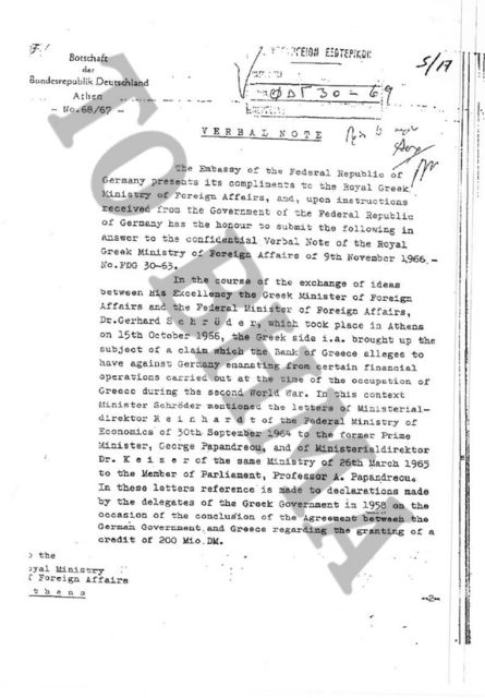 «Κατά τη διάρκεια ανταλλαγής ιδεών μεταξύ της αυτού εξοχότητος του έλληνα υπουργού Εξωτερικών και του ομοσπονδιακού υπουργού Εξωτερικών δρος Γκέρχαρντ Σρέντερ που έλαβε χώρα στην Αθήνα τη 15η Οκτωβρίου 1966, η ελληνική πλευρά, μεταξύ άλλων, ήγειρε το ζήτημα των αξιώσεων τις οποίες η Τράπεζα της Ελλάδος ισχυρίζεται ότι έχει εναντίον της Γερμανίας και οι οποίες προέρχονται από ορισμένες χρηματοοικονομικές επιχειρήσεις που διενεργήθηκαν κατά τη διάρκεια της Κατοχής της Ελλάδας τον Β’ Παγκόσμιο Πόλεμο. Σε αυτό το πλαίσιο ο υπουργός Σρέντερ ανέφερε τις επιστολές του διευθυντή του ομοσπονδιακού υπουργείου των Οικονομικών Ράινχαρντ της 30ής Σεπτεμβρίου 1964 στον πρώην πρωθυπουργό Γεώργιο Παπανδρέου και του διευθυντή του ίδιου υπουργείου δρος Κάιζερ της 26ης Μαρτίου 1965 στον βουλευτή-καθηγητή Α. Παπανδρέου. Σε αυτές τις επιστολές γίνεται αναφορά σε δηλώσεις που έγιναν από τους αντιπροσώπους της ελληνικής κυβέρνησης το 1958 με την ευκαιρία της ολοκλήρωσης της συμφωνίας μεταξύ της γερμανικής κυβέρνησης και της Ελλάδας που αφορά τη χορήγηση πίστωσης 200 εκατ. μάρκων».