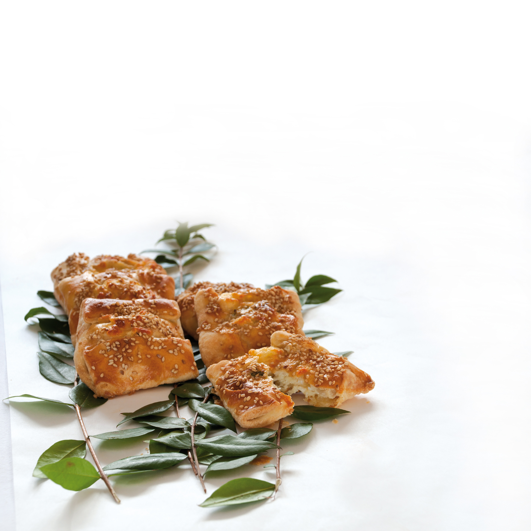 Αλευρώνουµε ελαφρά τον πάγκο της κουζίνας και µε τον πλάστη ανοίγουµε κάθε µπάλα σε στρογγυλό φύλλο διαµέτρου 15 εκ. Βάζουµε στη µέση µια µπάλα γέµισης, την πατάµε ώστε να απλωθεί και κλείνουµε σαν φάκελο, φέρνοντας στο κέντρο τις τέσσερις άκρες, αφήνοντας ωστόσο ένα µικρό άνοιγµα στη µέση.