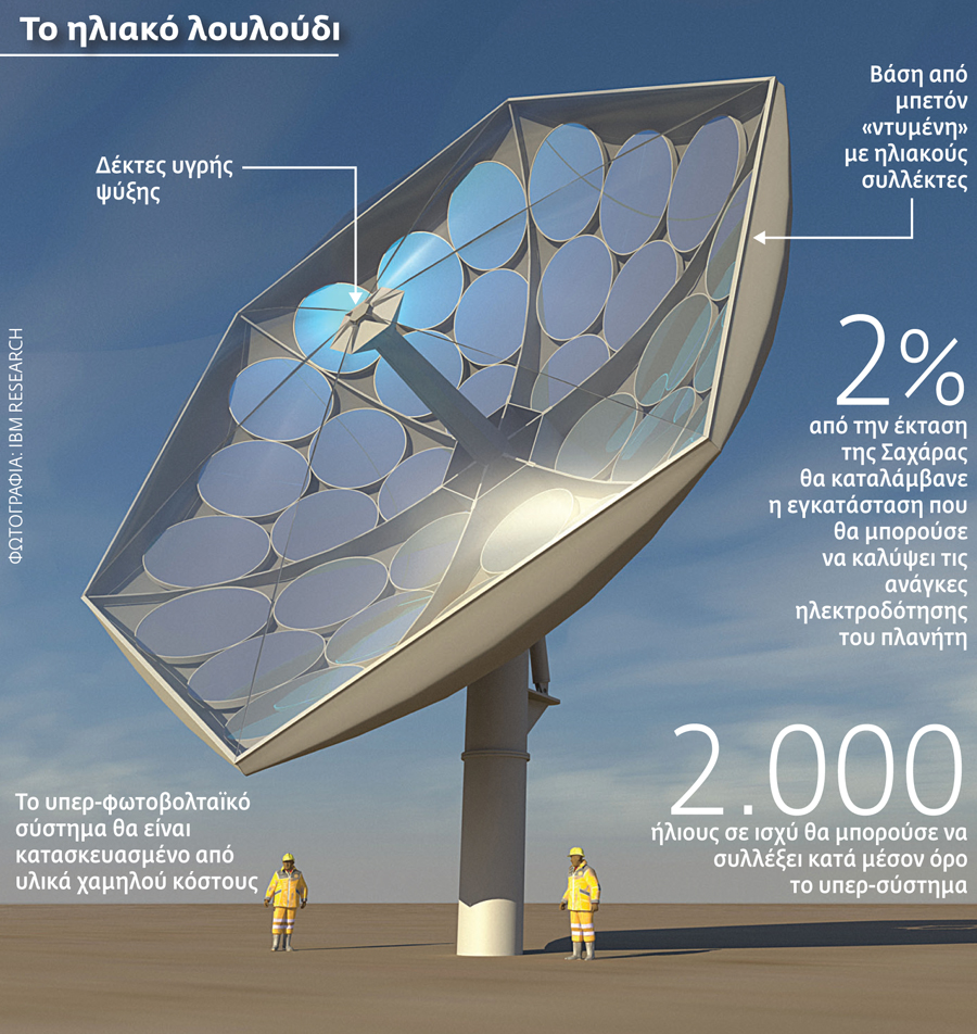 Ενα πανίσχυρο φωτοβολταϊκό «λουλούδι», ικανό κατά τους ειδικούς να συσσωρεύσει την ισχύ… «2.000 ήλιων» και ταυτόχρονα να αφαλατώνει μεγάλες ποσότητες νερού και να προσφέρει κλιματισμό, είναι το αποτέλεσμα της συνεργασίας ανάμεσα σε επιστήμονες των εργαστηρίων της IBM, της εταιρείας φωτοβολταϊκών Airlight Energy και ελβετικών πανεπιστημίων.