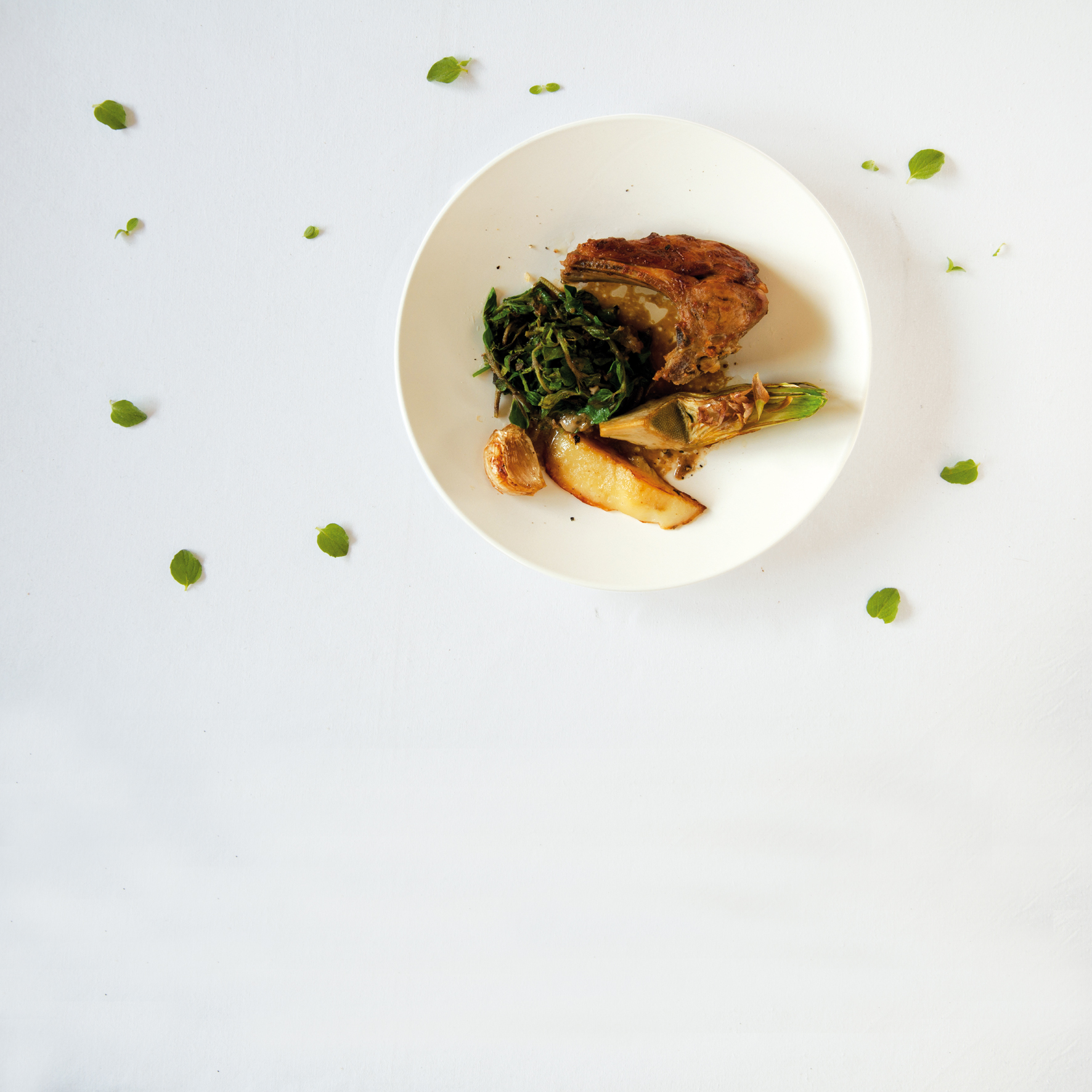 Σε ταψί ή σε γάστρα τοποθετώ τη ρίγανη σαν µια µεγάλη χούφτα κάτω από 4-5 κιλά αρνάκι από µπούτι και σπάλα που θα βάλω στον φούρνο. Καθαρίζω και κόβω 1.500 γρ. πατάτες κυδωνάτες, καθαρίζω 7-8 φρέσκες αγκινάρες και τις βάζω δίπλα του.